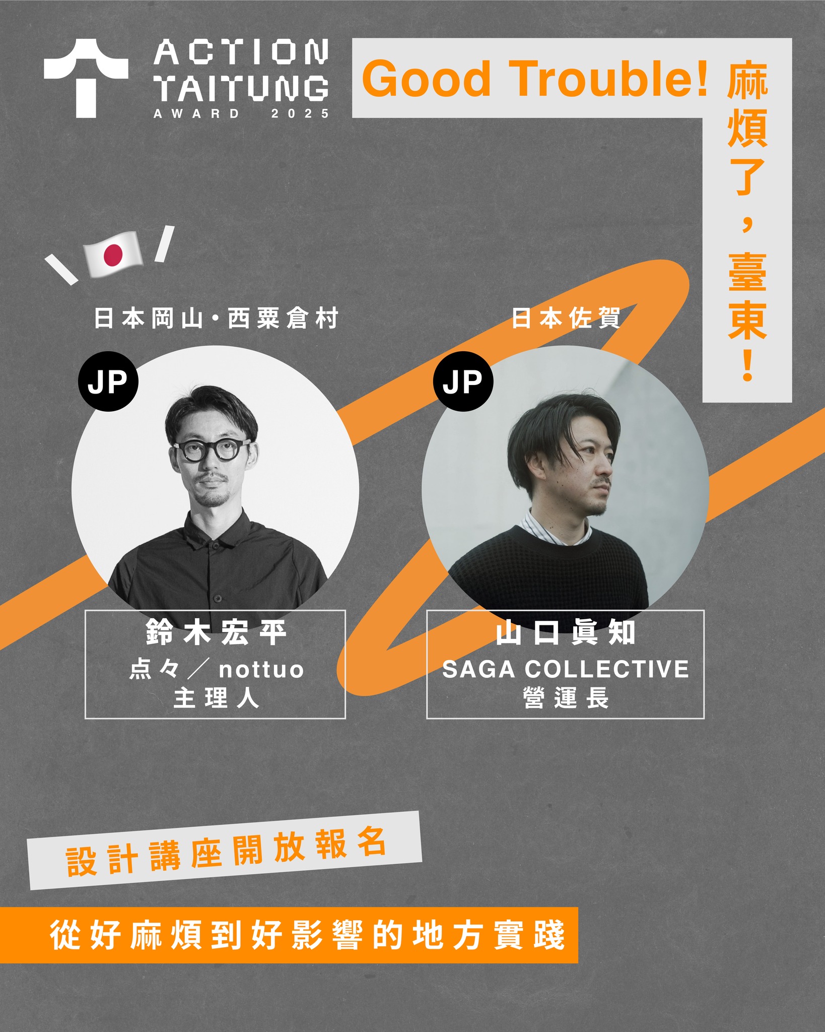 2025 Action Taitung Award以「麻煩了,臺東!Good Trouble」為主題,由《Shopping Design》特別策劃兩場講座,以「好麻煩到好影響的地方實踐」為核心,邀請兩位來自日本、極具代表性的地方設計實踐者前來臺東,透過日本的實際案例,分享設計如何走進地方生活。同時,也讓臺東地方團隊、創意工作者與政府夥伴,從中汲取更多經營靈感。