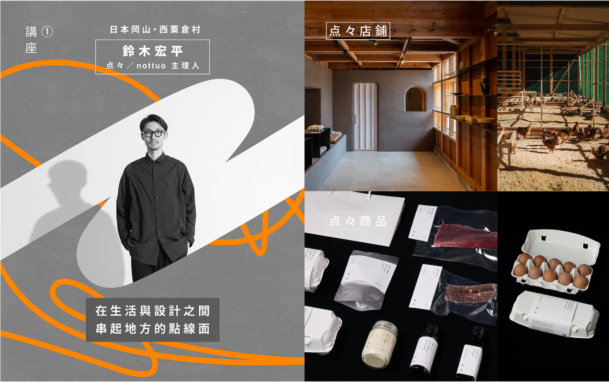 來自岡山縣西粟倉村的設計師鈴木宏平,長年以設計作為參與地方的方法,從農產包裝、工藝再詮釋到古民家改造,實踐跨越產品、空間、經營的整合思維。在這場講座中,他將回到自己從城市移居鄉村的起點,並以設計公司「nottuo」與地域品牌「点々」的實際案例,分享設計如何從地方特質出發,建立可長期運作的地域品牌節奏。