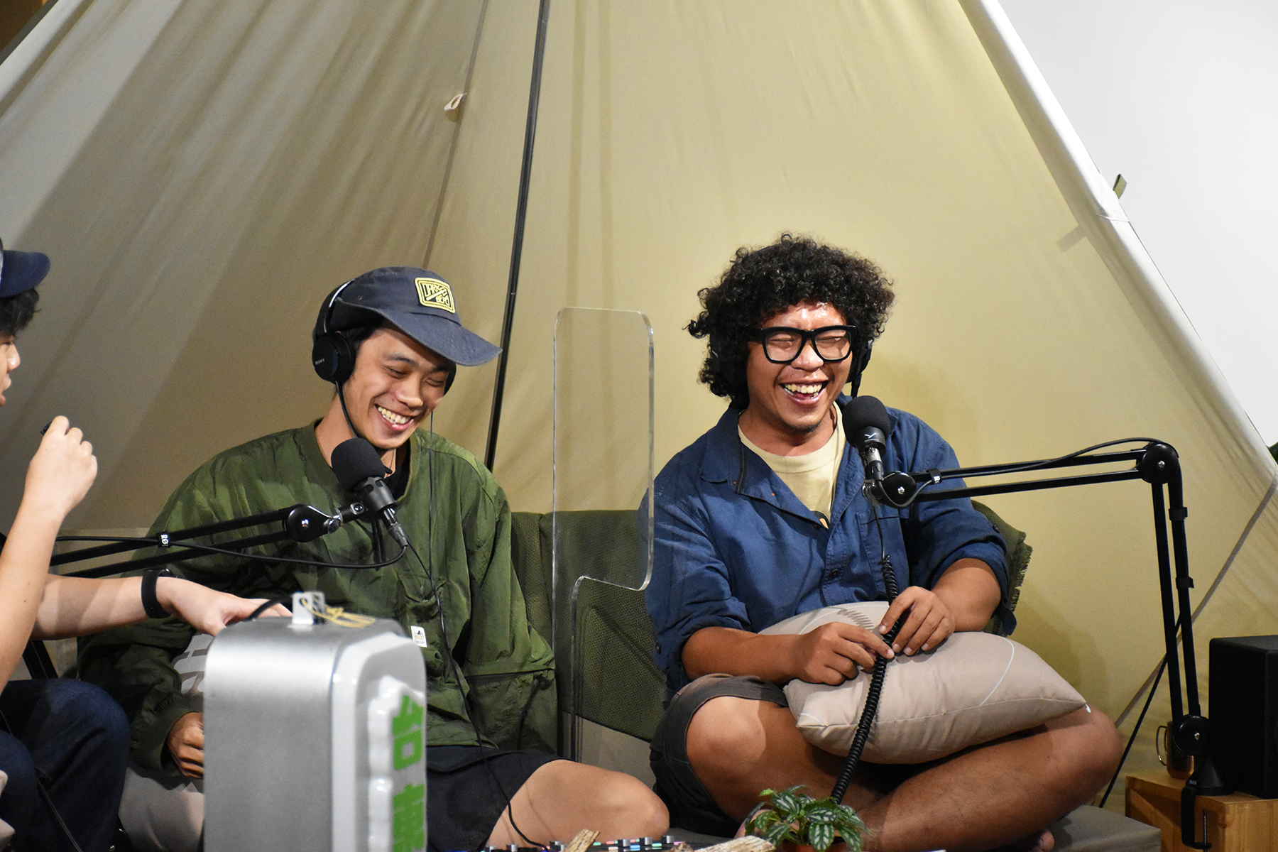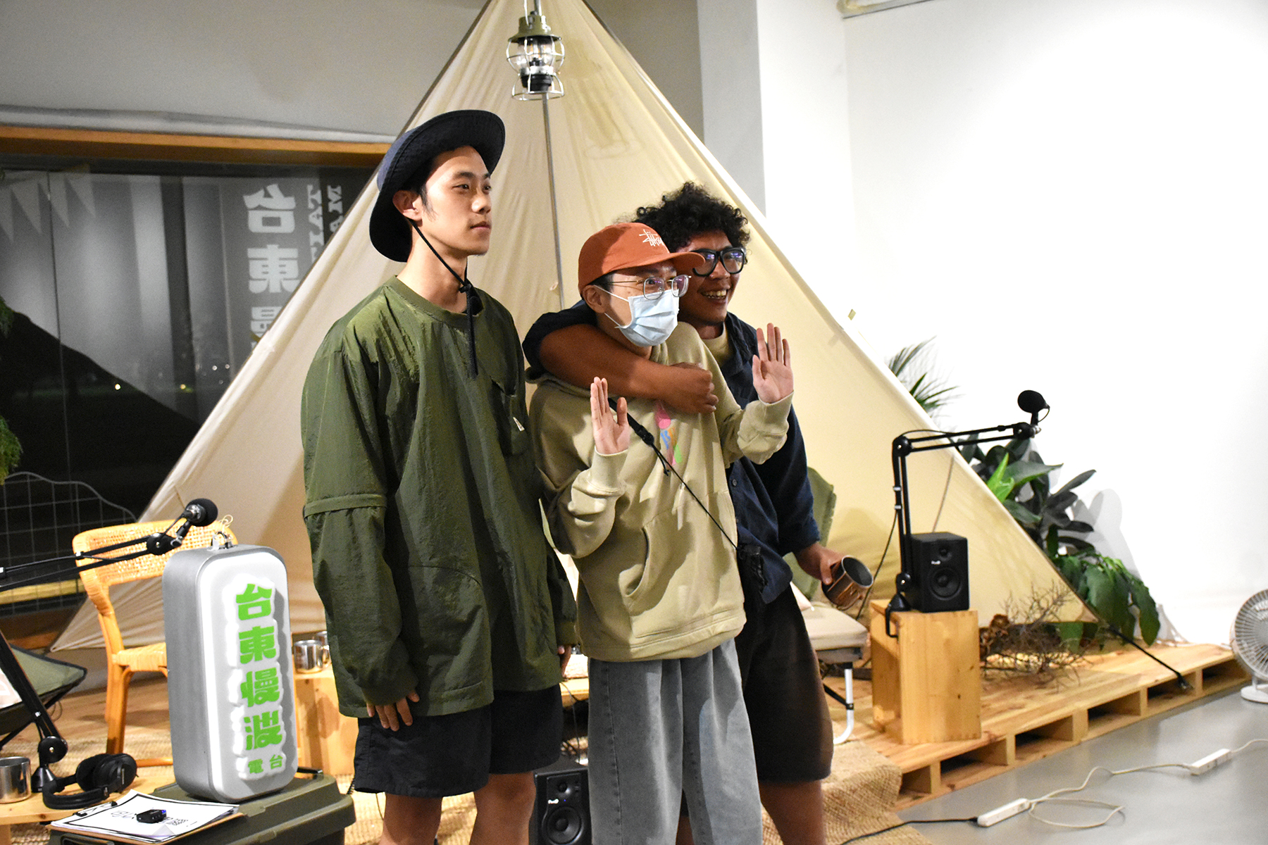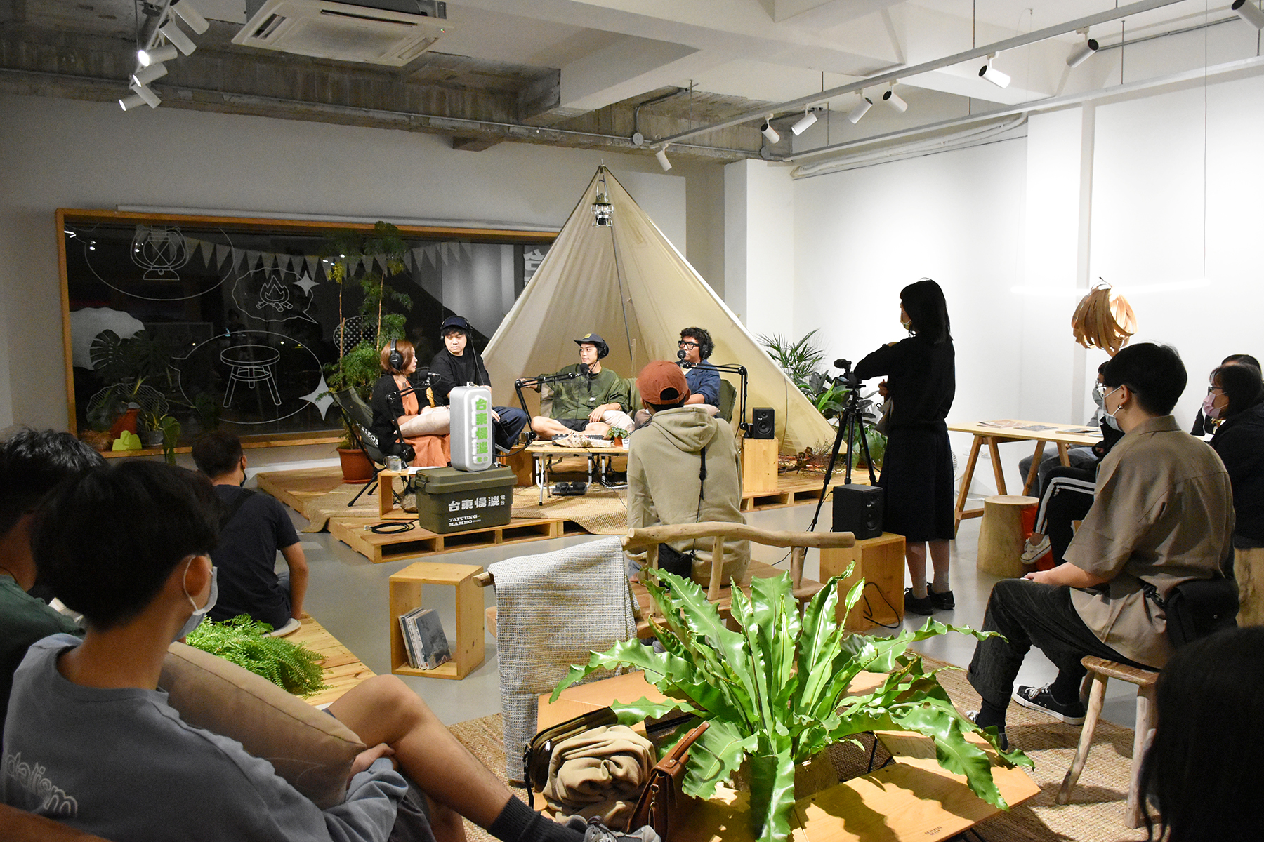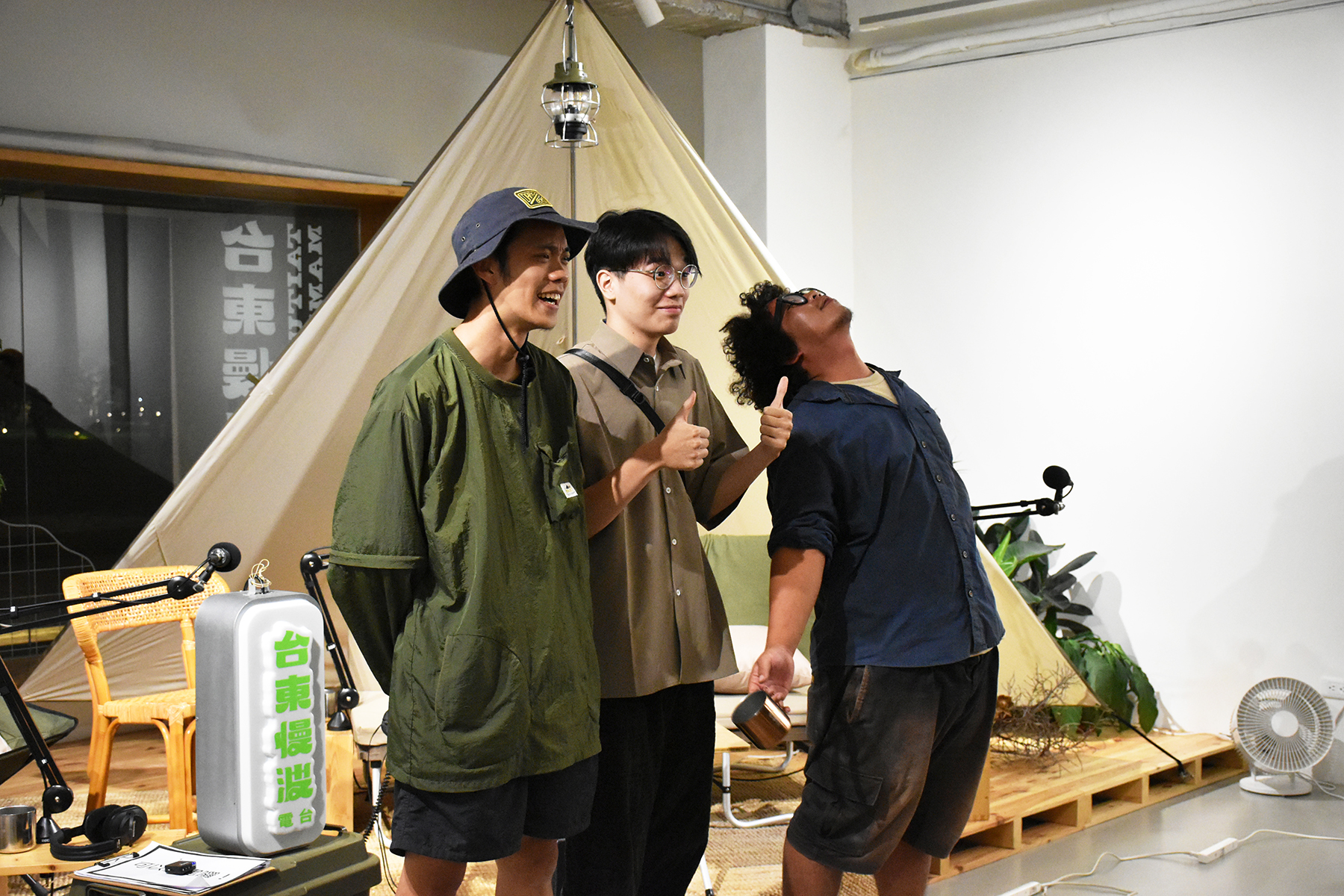 台東慢波電台自2021年5月開播以來,一連舉辦三場LIVE PODCAST,讓波友們近距離一窺慢波電台的錄製現場,以及來賓和主持人最真實的互動。與其說是錄音室,慢波電台或許更像是個聊天室,團隊起初在規劃電台空間時,沒有選擇專業錄音室應當出現的配置,而是架起帳篷、露營椅、露營燈,以及被植物環繞的開放性場域,期待設計中心能成為臺東人的客廳,邀請你一起進來聊天吧!