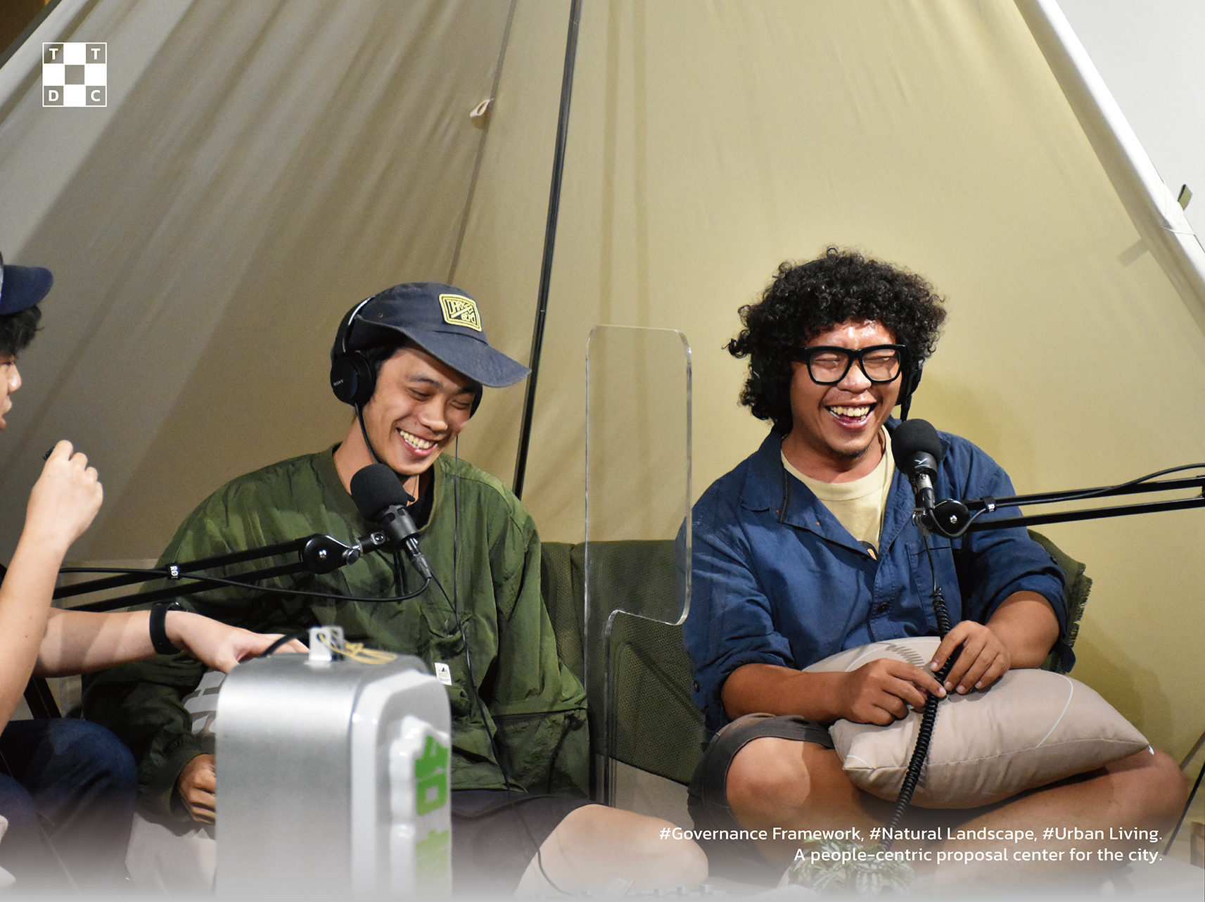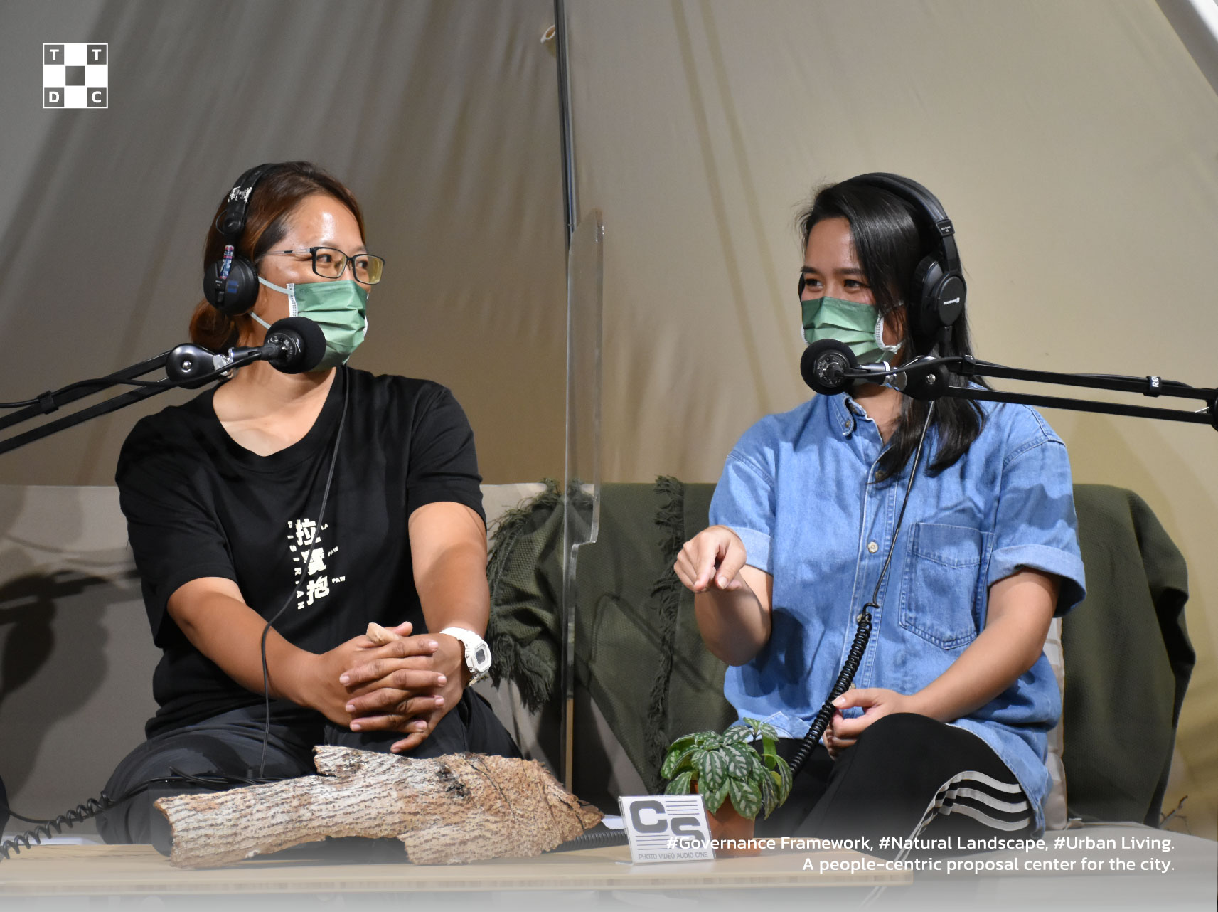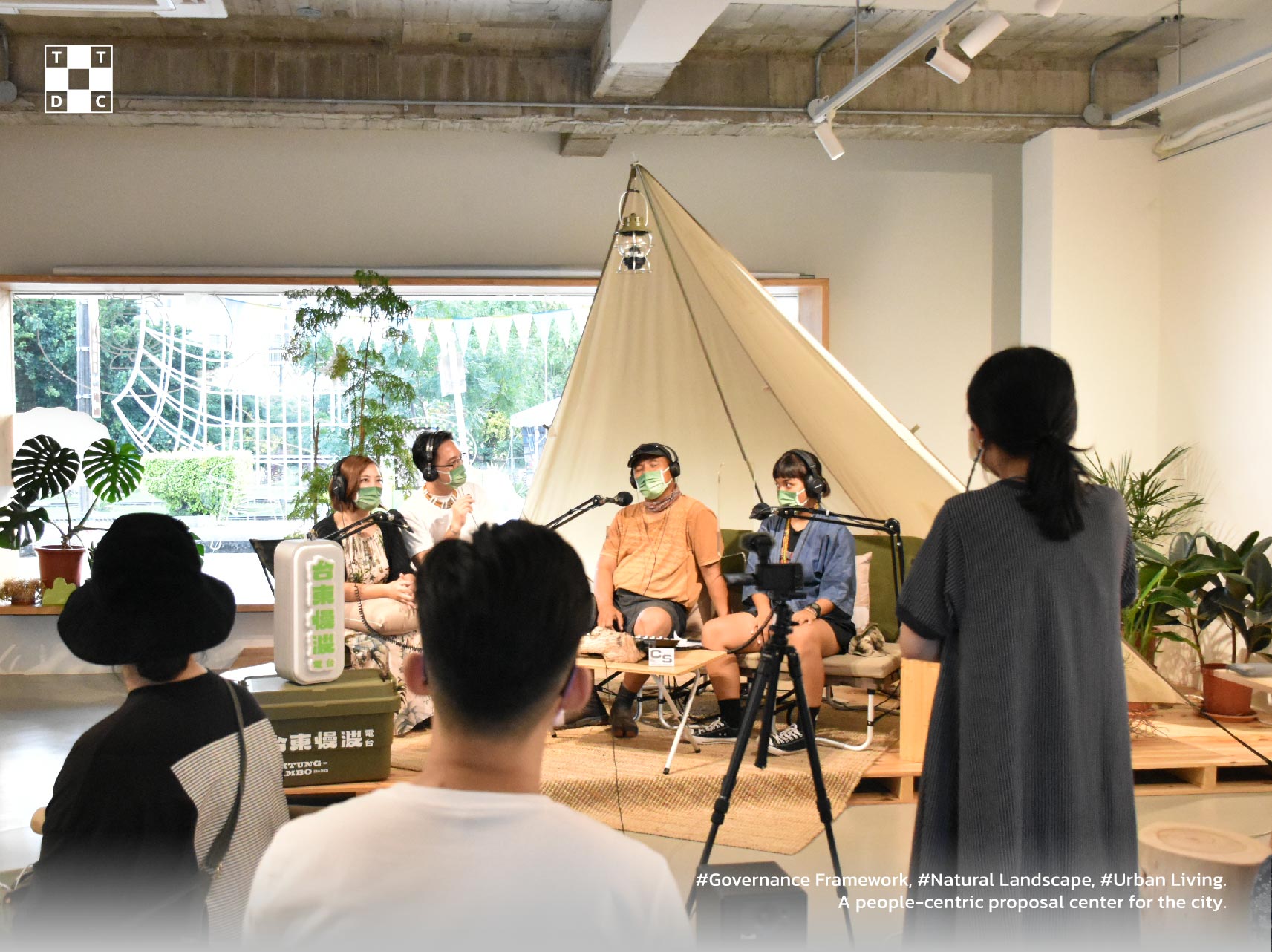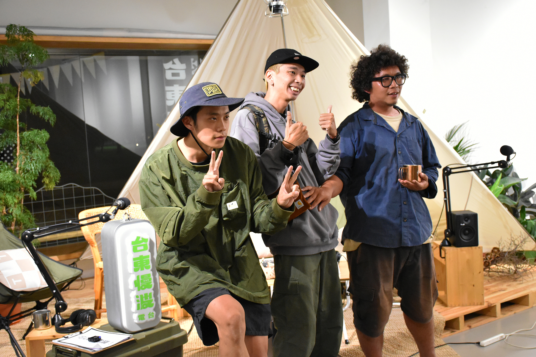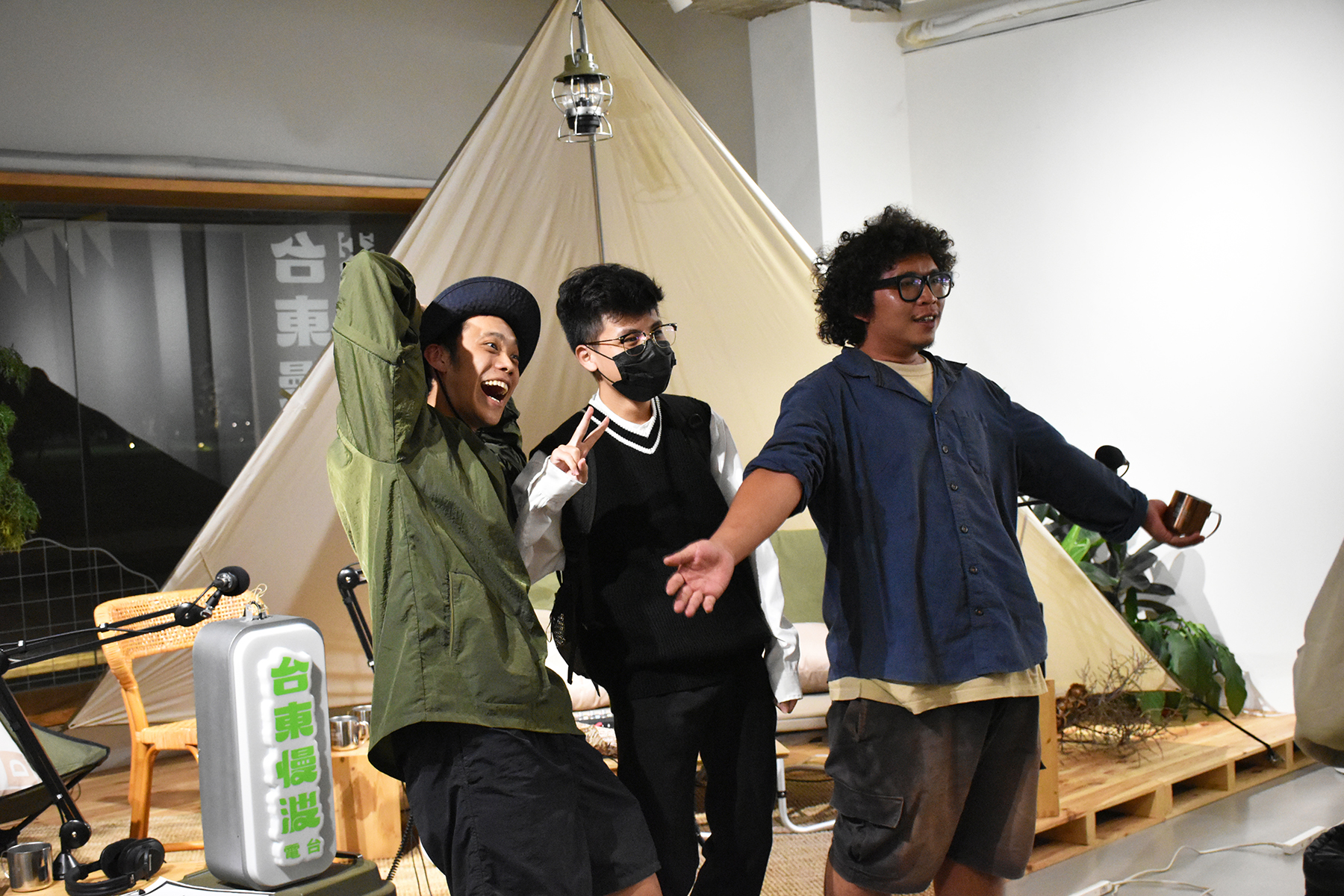 台東慢波電台自2021年5月開播以來,一連舉辦三場LIVE PODCAST,讓波友們近距離一窺慢波電台的錄製現場,以及來賓和主持人最真實的互動。與其說是錄音室,慢波電台或許更像是個聊天室,團隊起初在規劃電台空間時,沒有選擇專業錄音室應當出現的配置,而是架起帳篷、露營椅、露營燈,以及被植物環繞的開放性場域,期待設計中心能成為臺東人的客廳,邀請你一起進來聊天吧!
