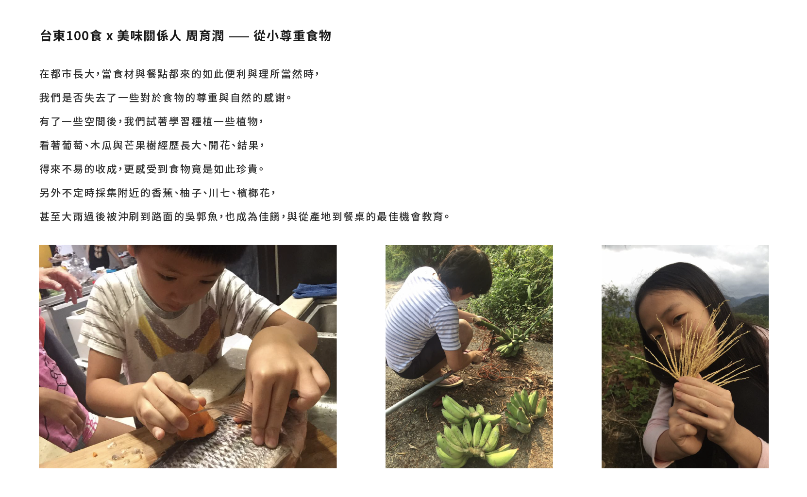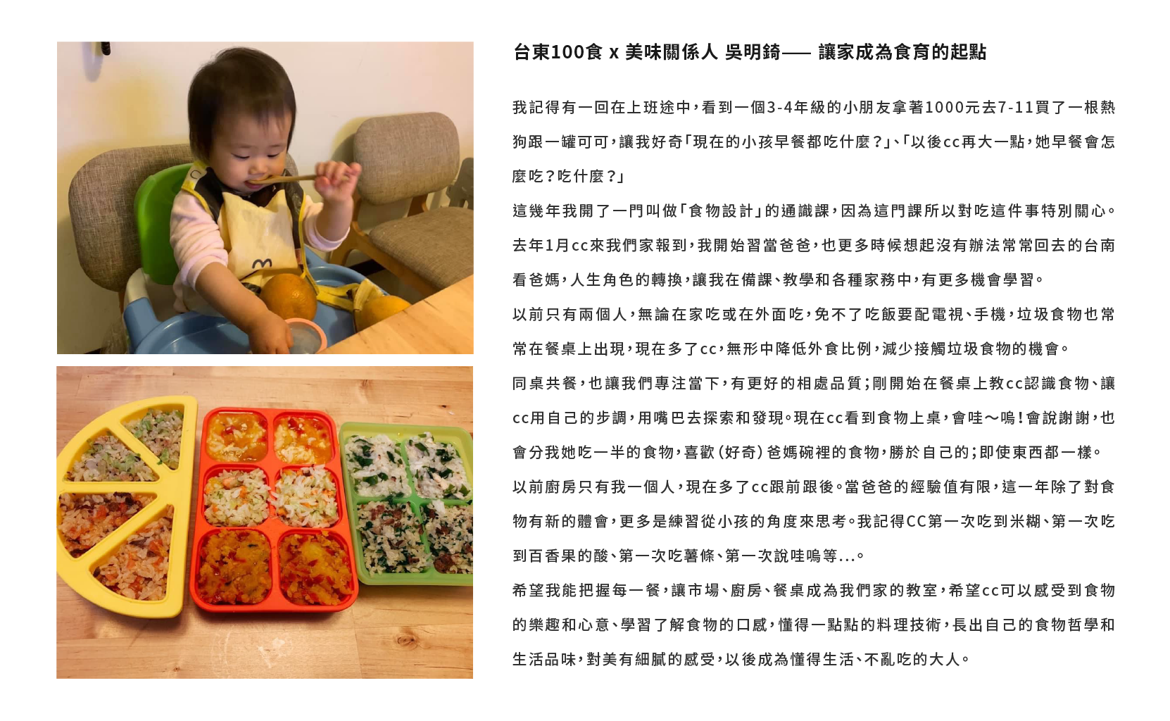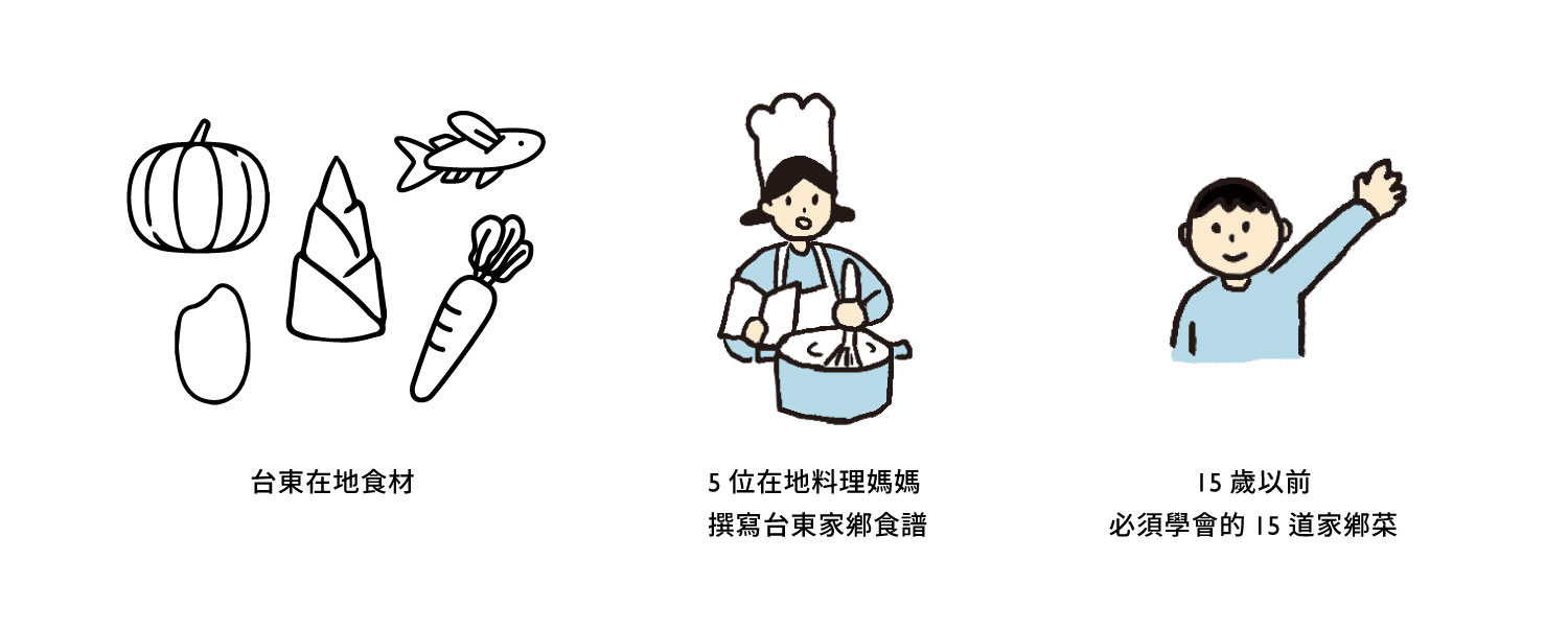 在田調過程中,發現在台東,許多的孩童需要自己料理三餐。台東食育提案所遂邀請了 5 位台東在地的料理達人,為小朋友發想了15道用台東在地食材烹飪料理的書,希望讓台東的孩子,在15歲以前就能學會的家鄉菜,除了能夠照顧自己之外,未來出外,也能夠運用自己家鄉的料理交朋友。