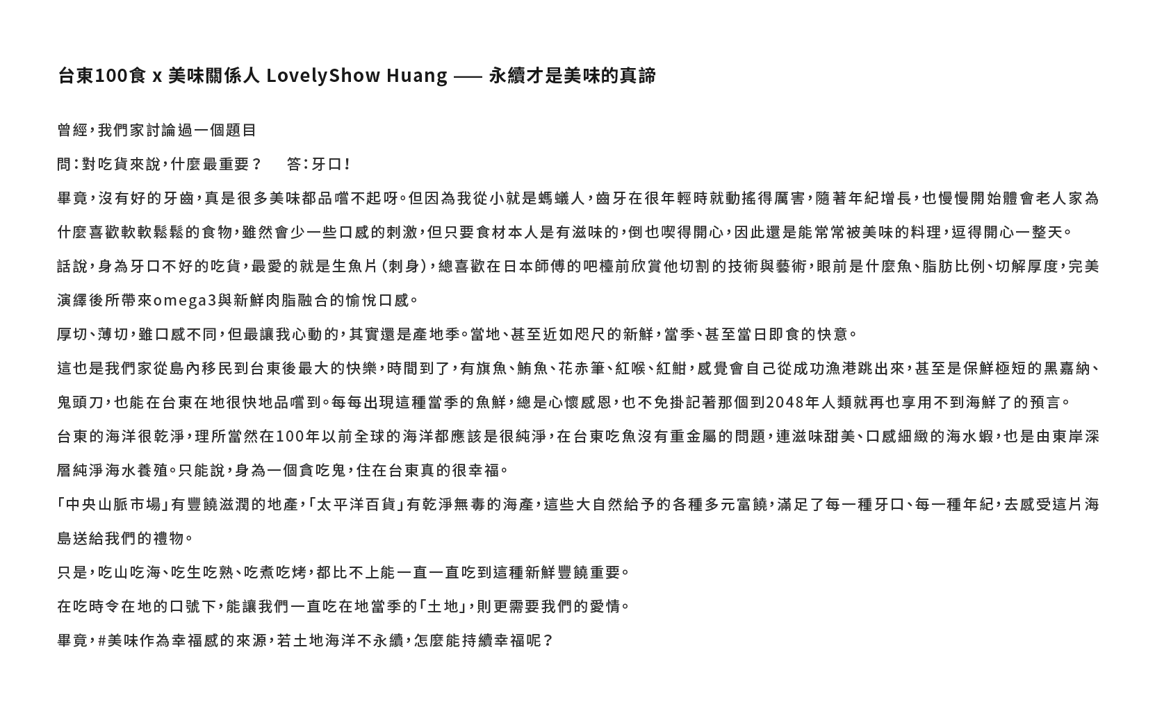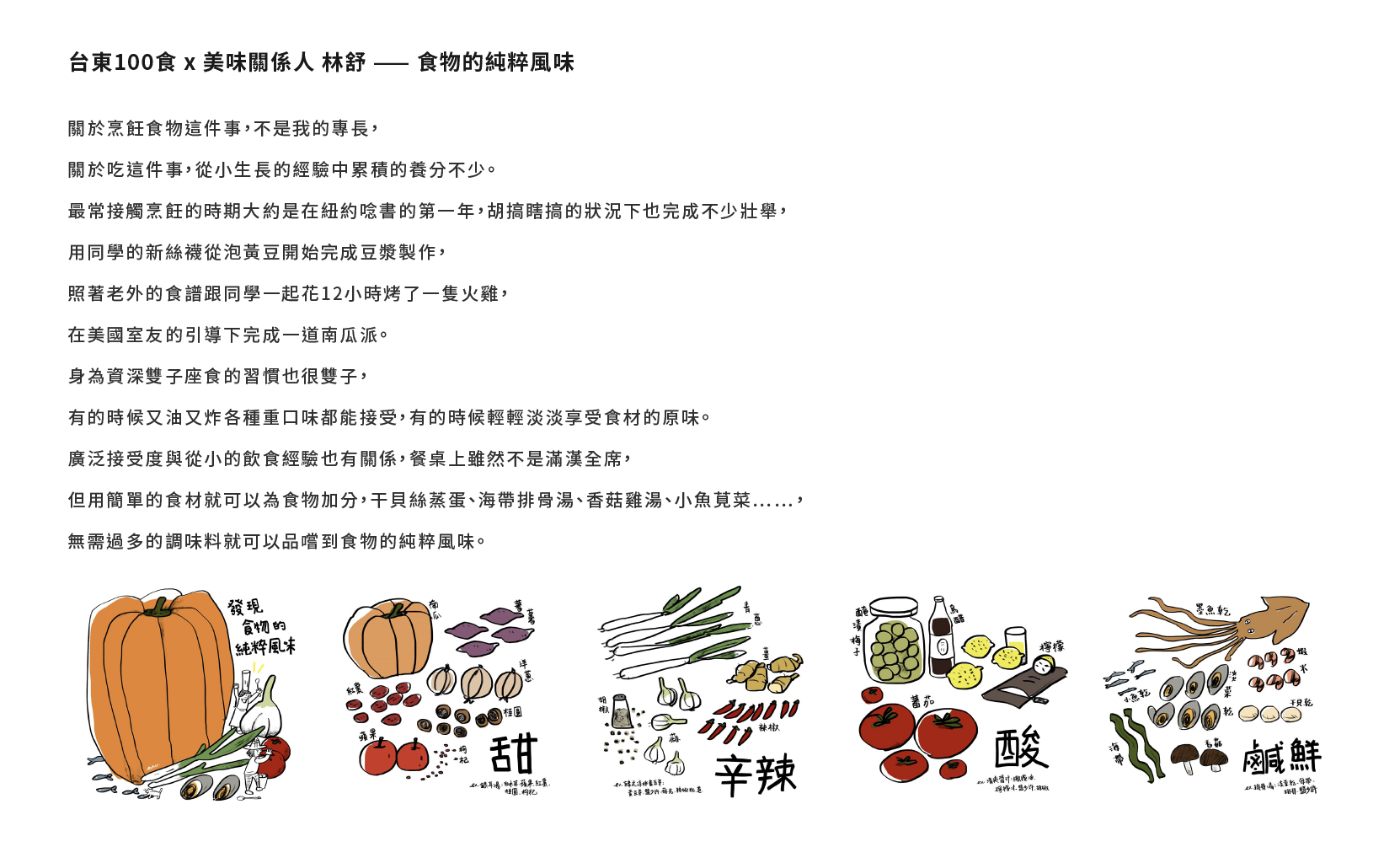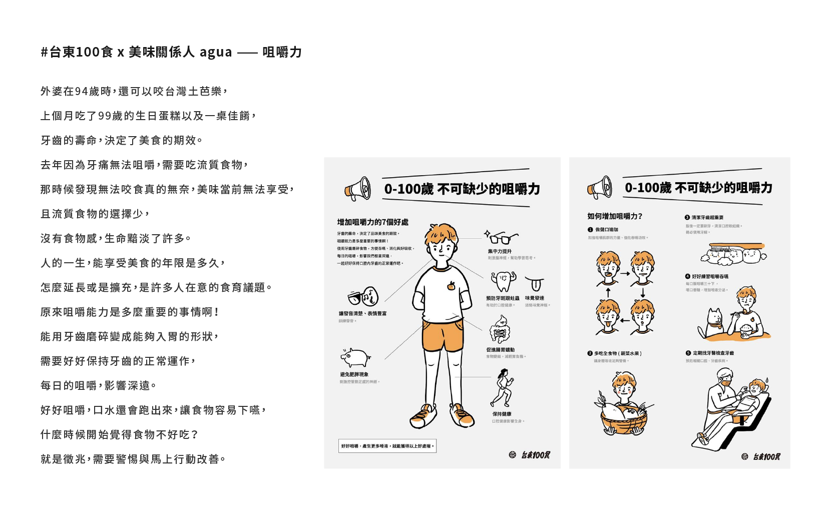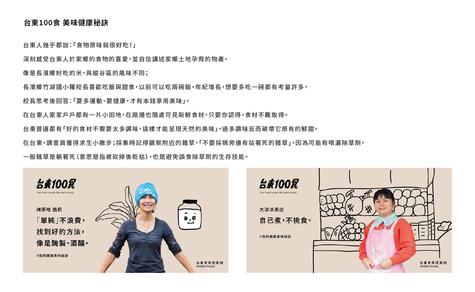 吃這件事,不僅是吃,環繞在食的環節,到底有多少?我們在0-100歲之間,如何時時刻刻都享受到美味與健康呢?吃什麼、怎麼吃、跟誰吃,一日三餐,10年下來上萬頓餐點,可以改變一個人。台東食育提案所邀約了許多美味關係人的參與,台東100食將看到各種食的議題!
