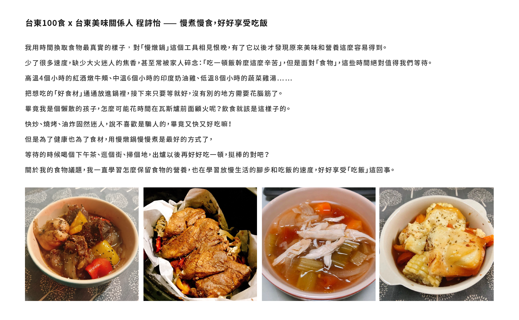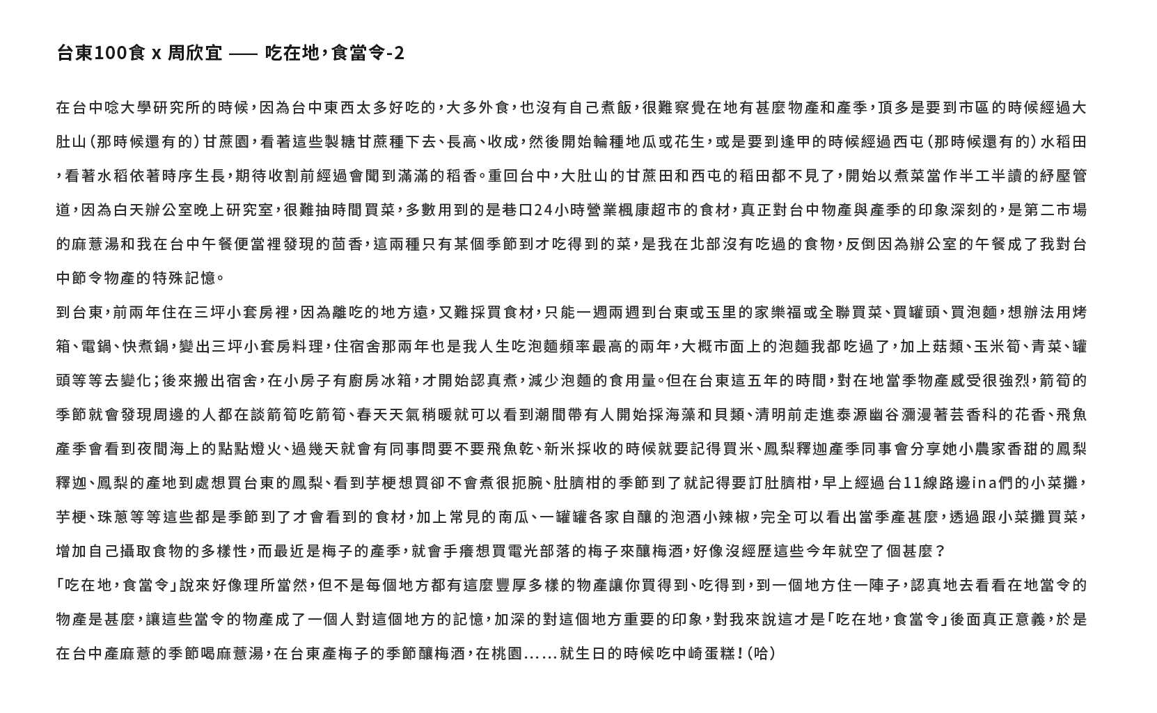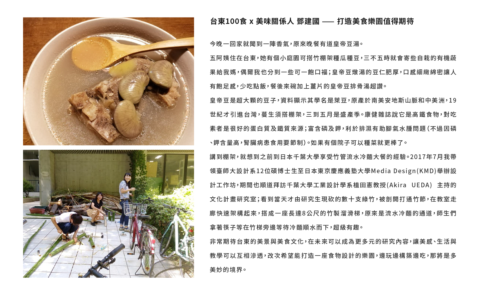吃這件事,不僅是吃,環繞在食的環節,到底有多少?我們在0-100歲之間,如何時時刻刻都享受到美味與健康呢?吃什麼、怎麼吃、跟誰吃,一日三餐,10年下來上萬頓餐點,可以改變一個人。台東食育提案所邀約了許多美味關係人的參與,台東100食將看到各種食的議題!