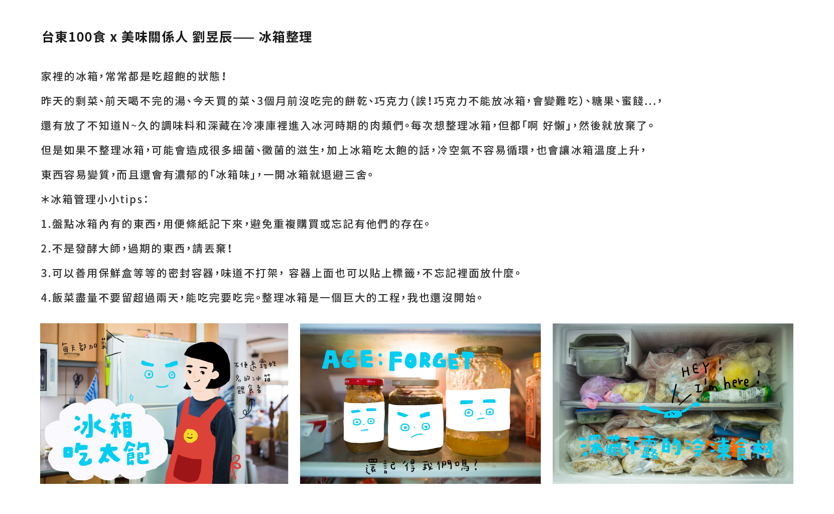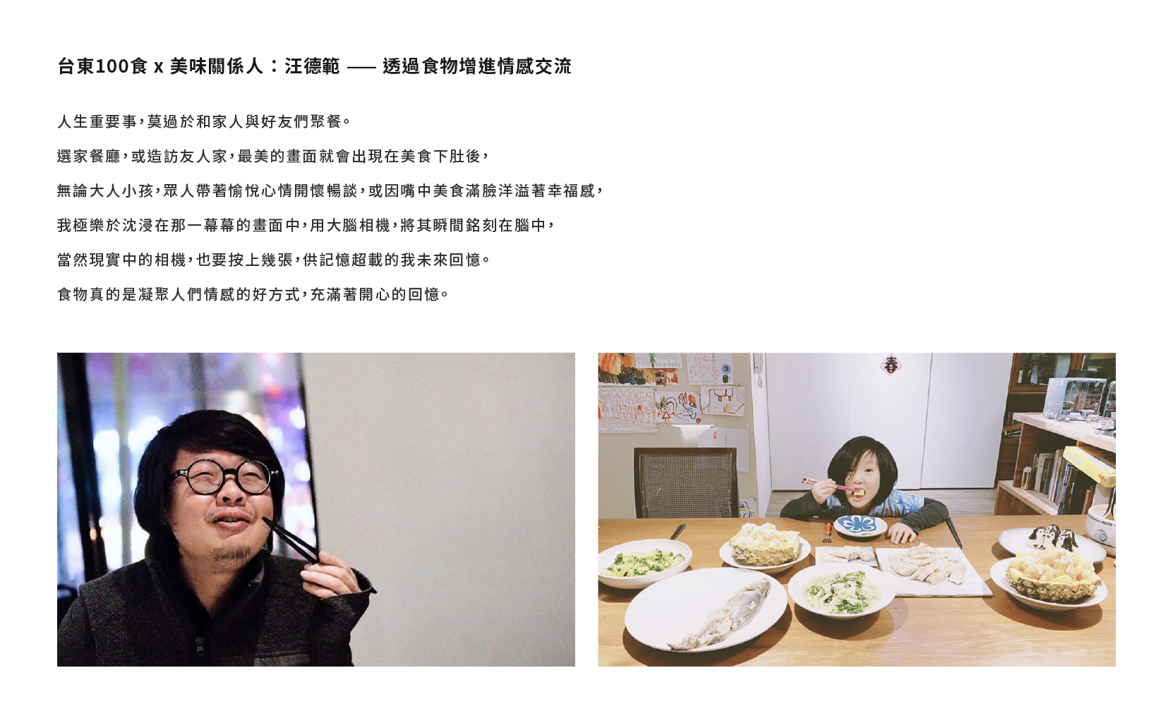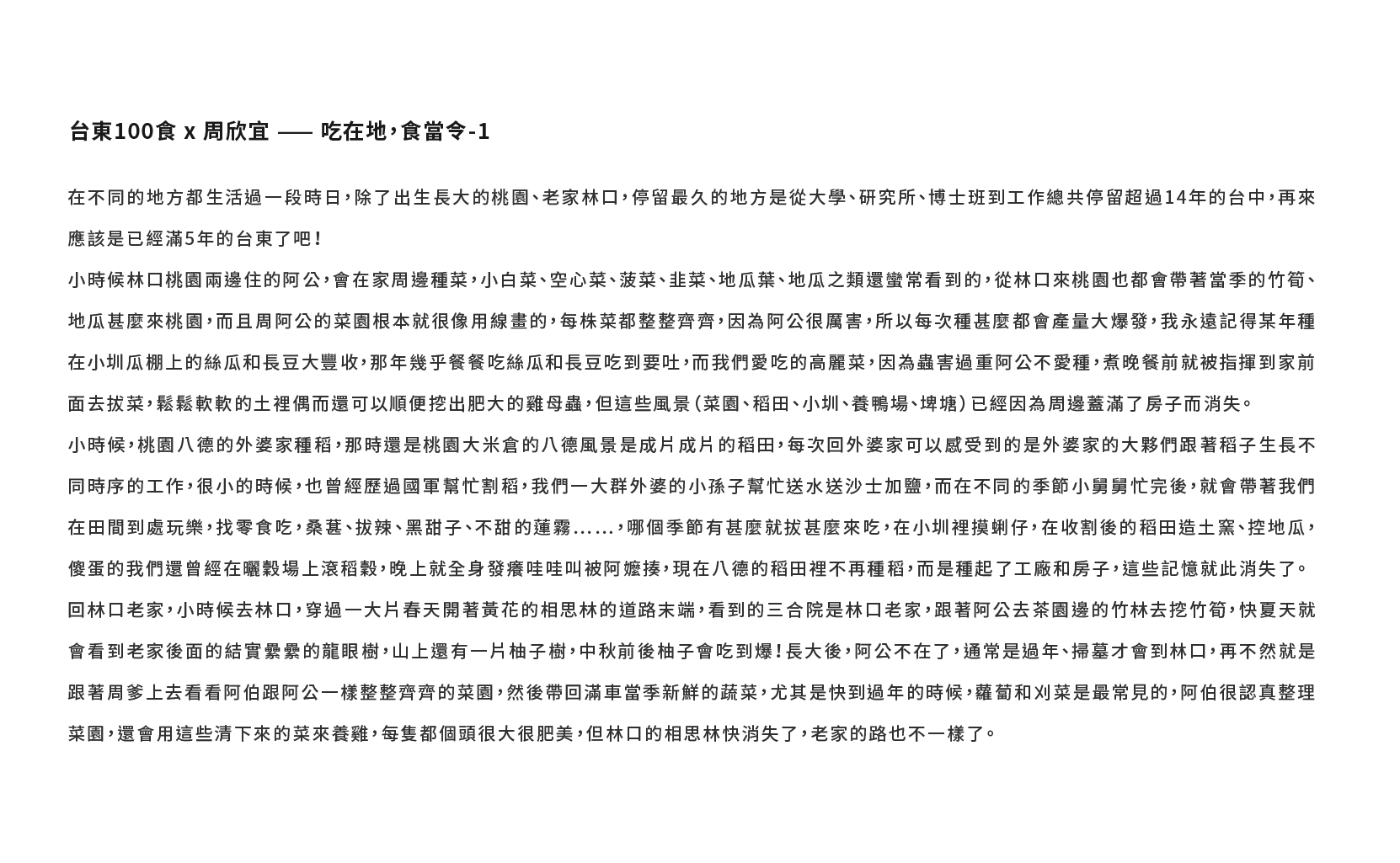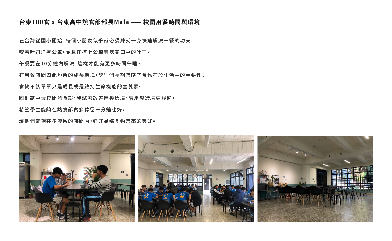 吃這件事,不僅是吃,環繞在食的環節,到底有多少?我們在0-100歲之間,如何時時刻刻都享受到美味與健康呢?吃什麼、怎麼吃、跟誰吃,一日三餐,10年下來上萬頓餐點,可以改變一個人。台東食育提案所邀約了許多美味關係人的參與,台東100食將看到各種食的議題!