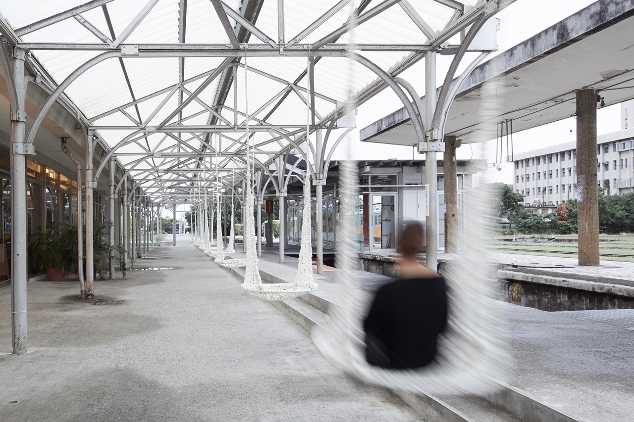 這裡是臺東舊站的月台,原本只有上下火車行色匆匆的旅客,或是特意買月台票送別或翹首等待的家人或戀人;無論何者,他們的目光只有火車上那心中的牽絆,而從來沒有好好看過這座月台。本展特別將展場延伸到月台,幾座鞦韆裝置,讓我們重新看見這座情感交流的月台。
