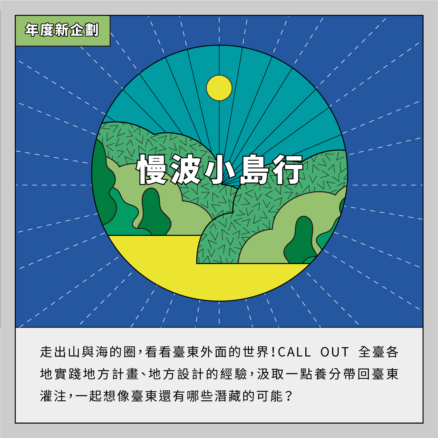 走出山與海的圈,看看臺東外面的世界!CALL OUT 全臺各地實踐地方計畫、地方設計的經驗,汲取一點養分帶回臺東灌注,一起想像臺東還有哪些潛藏的可能?