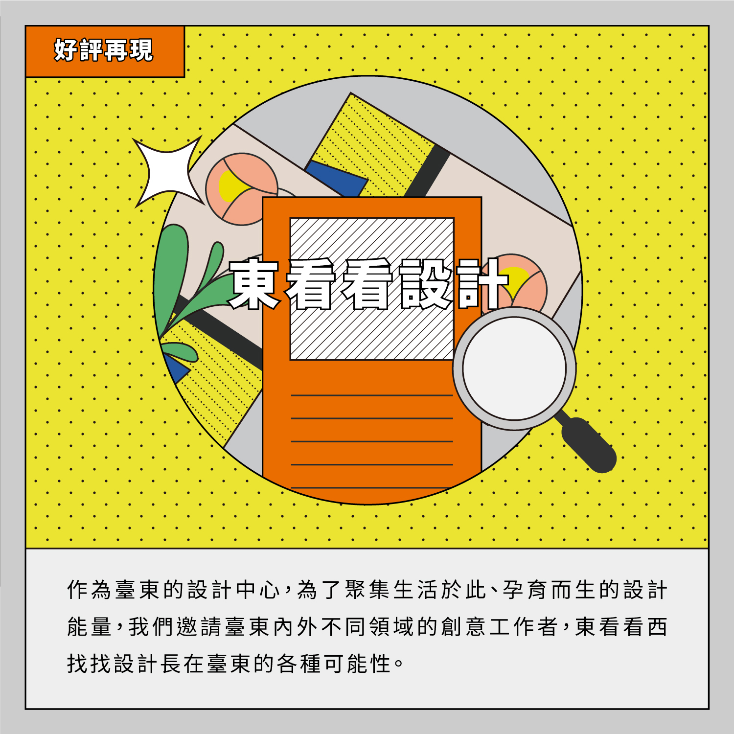 作為臺東的設計中心,為了聚集生活於此、孕育而生的設計能量,我們邀請臺東內外不同領域的創意工作者,東看看西找找設計長在臺東的各種可能性。