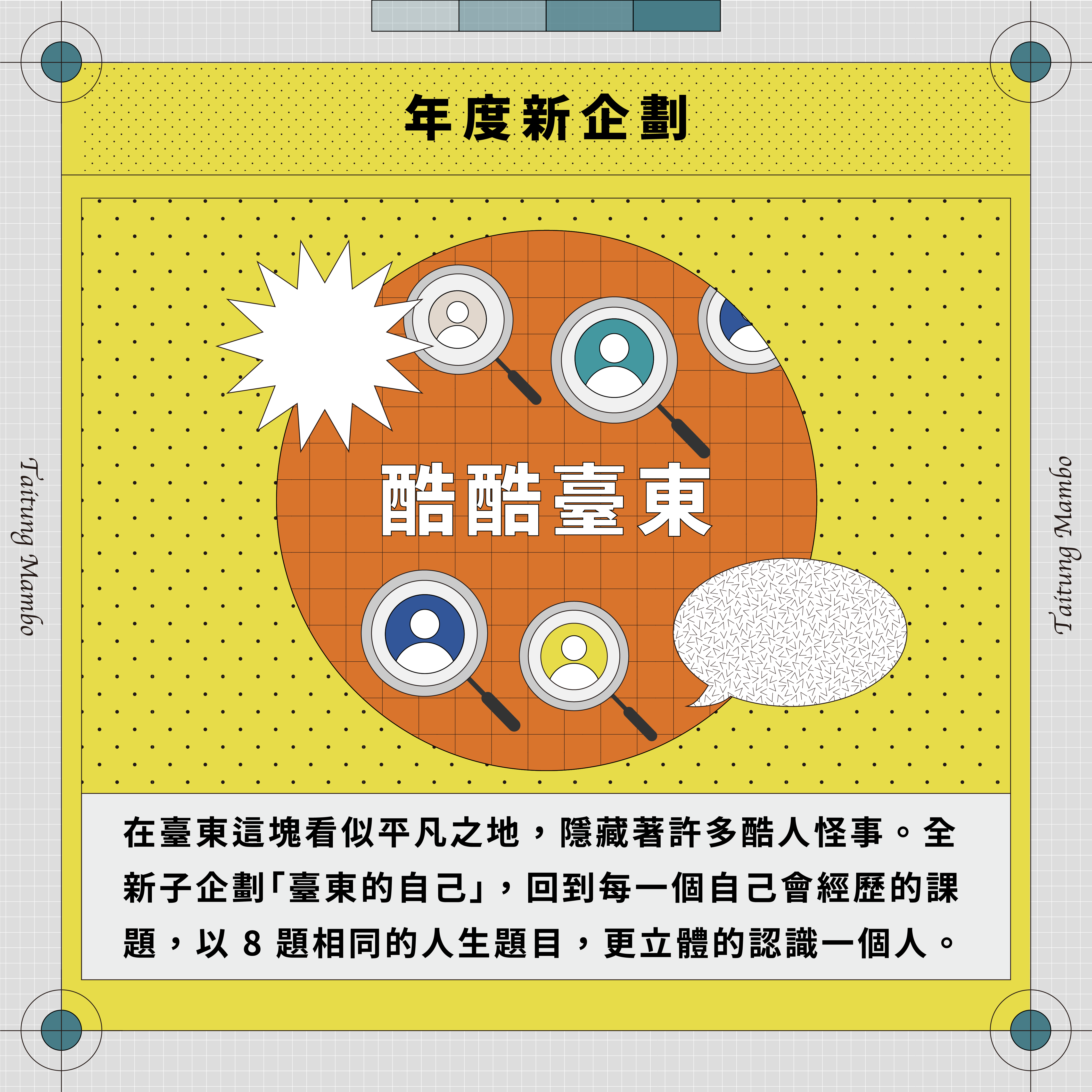 在臺東這塊看似平凡之地,隱藏著許多酷人怪事。全新子企劃「臺東的自己」,回到每一個自己會經歷的課題,以 8 題相同的人生題目,更立體的認識一個人。