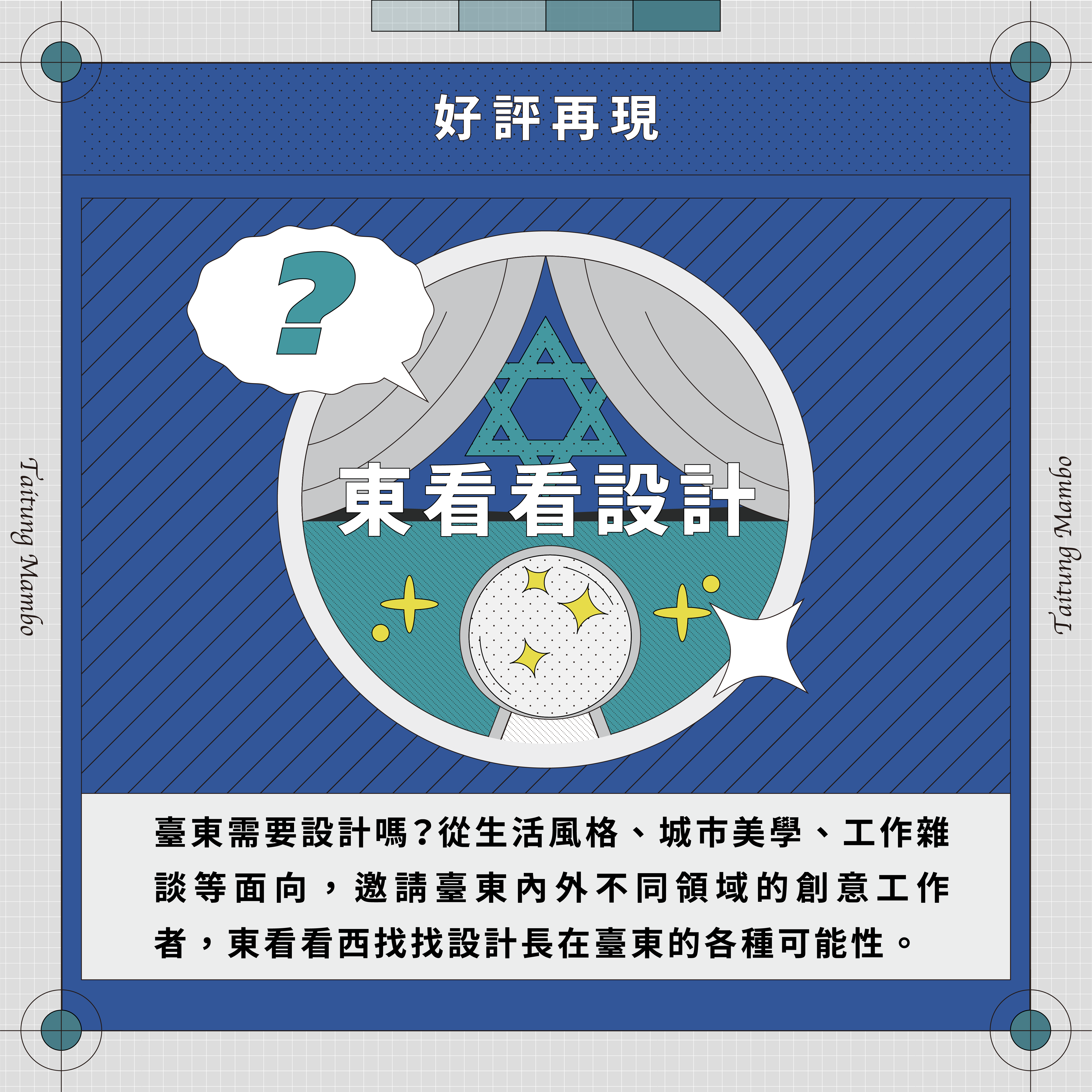 臺東需要設計嗎?從生活風格、城市美學、工作雜談等面向,邀請臺東內外不同領域的創意工作者,東看看西找找設計長在臺東的各種可能性。