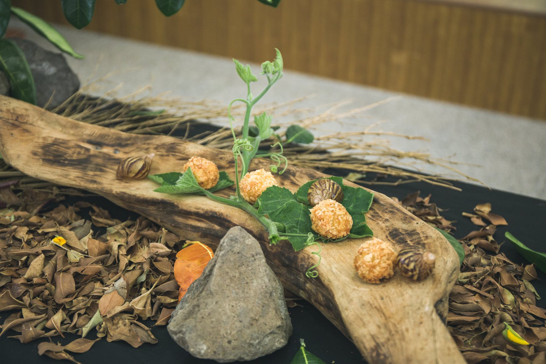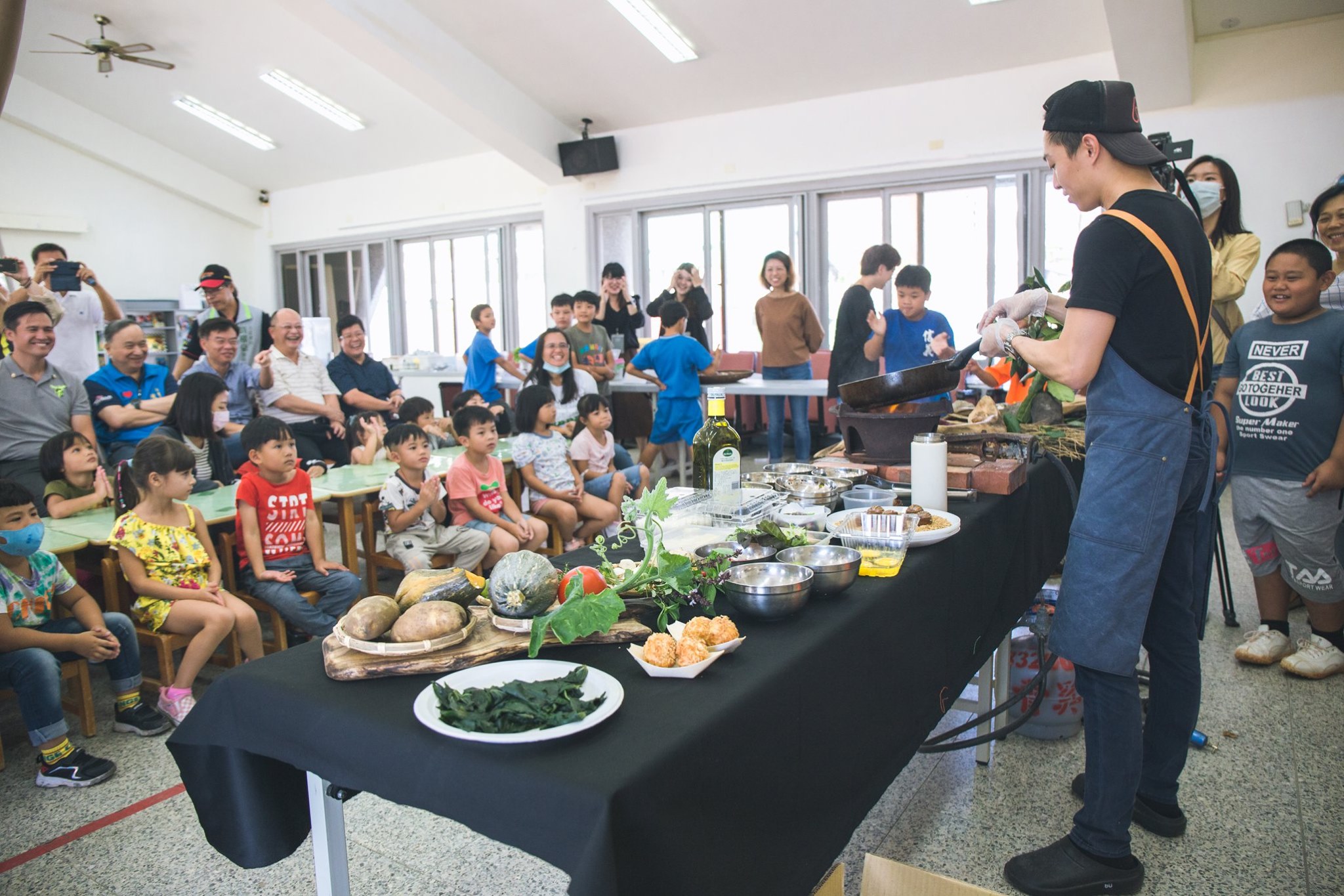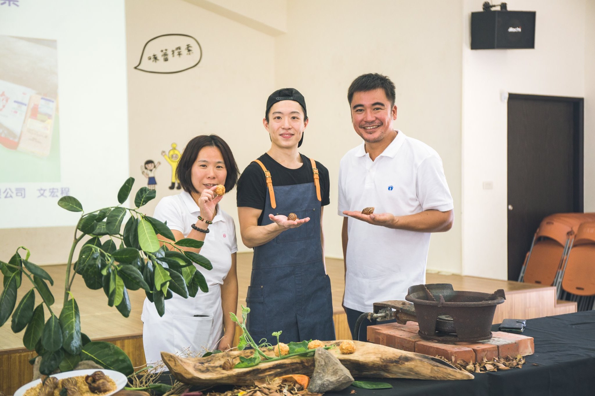我們邀請到長濱鄉的蝸牛達人 A-WOS 文宏程 與白玉公主王舒怡、 Sinasera 24烘焙主廚兼野廚料理師李人俊。文大哥與李主廚運用白玉蝸牛研發三道料理,分別是白玉蝸牛沙拉、白玉蝸牛薯泥球及地瓜葉白玉蝸牛卷,於現場烹飪教學。並且李主廚對於擺盤十分講究,讓同學們不僅從味道,更可以從視覺上享受、品味「食」。
