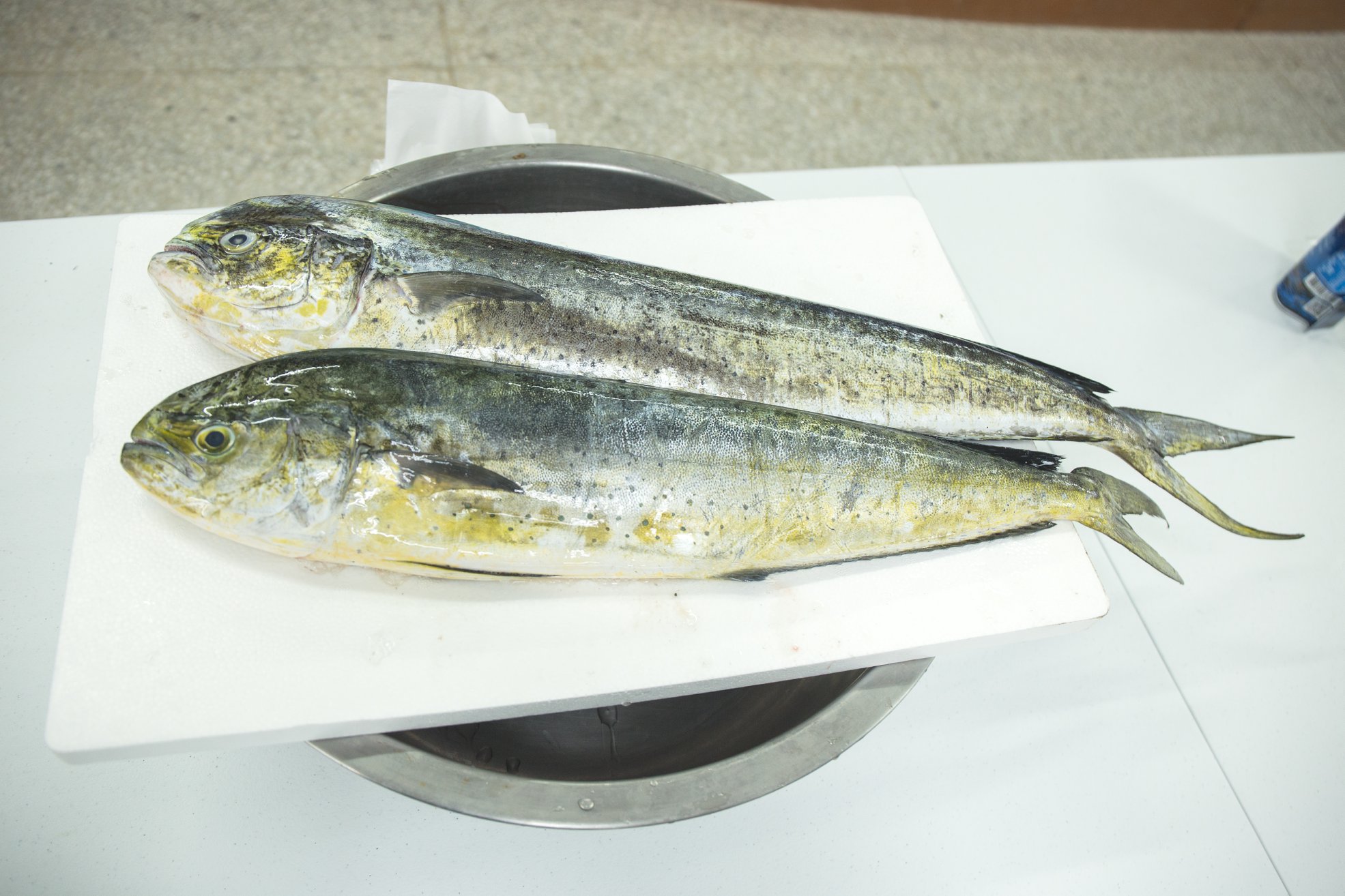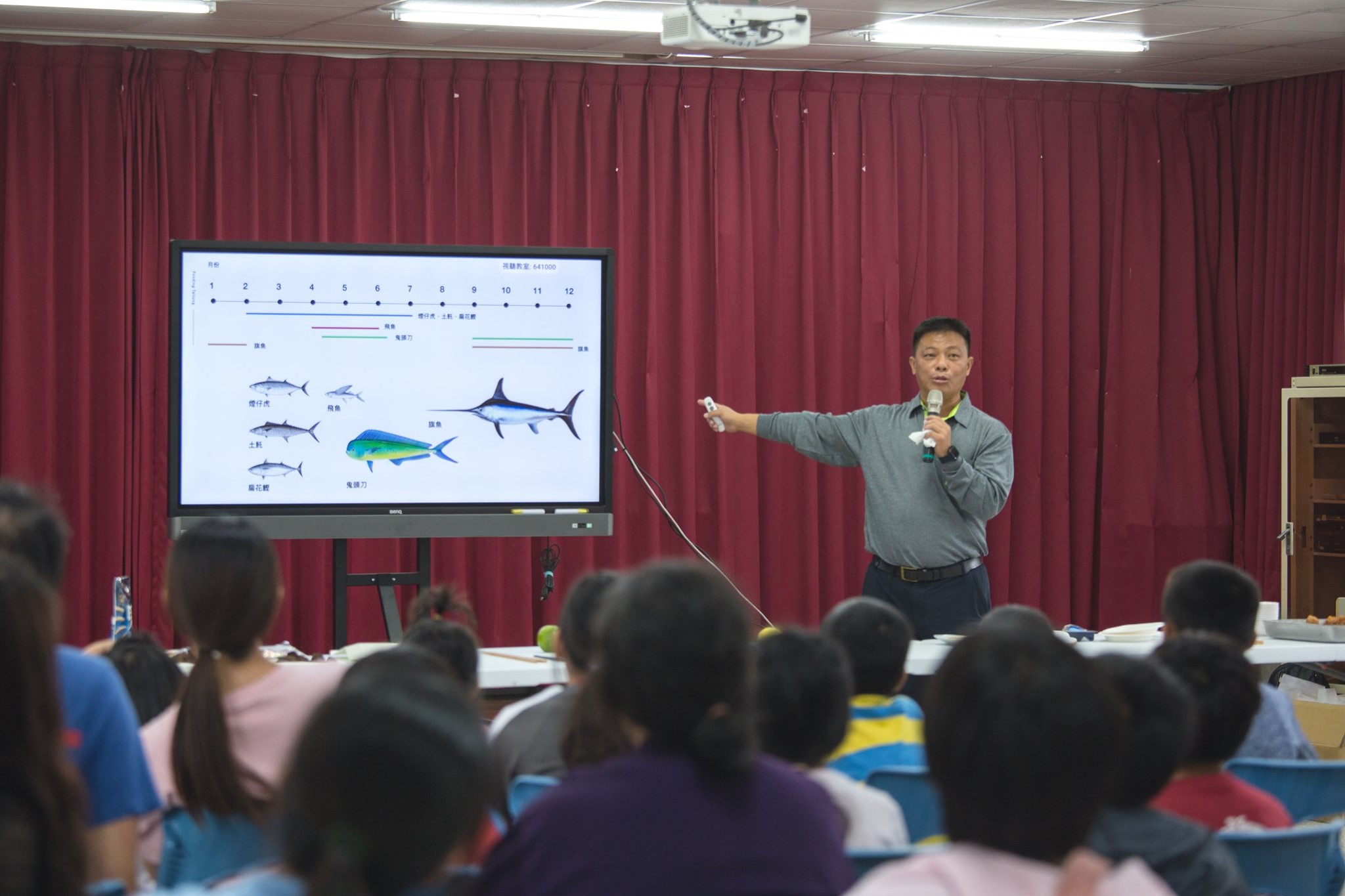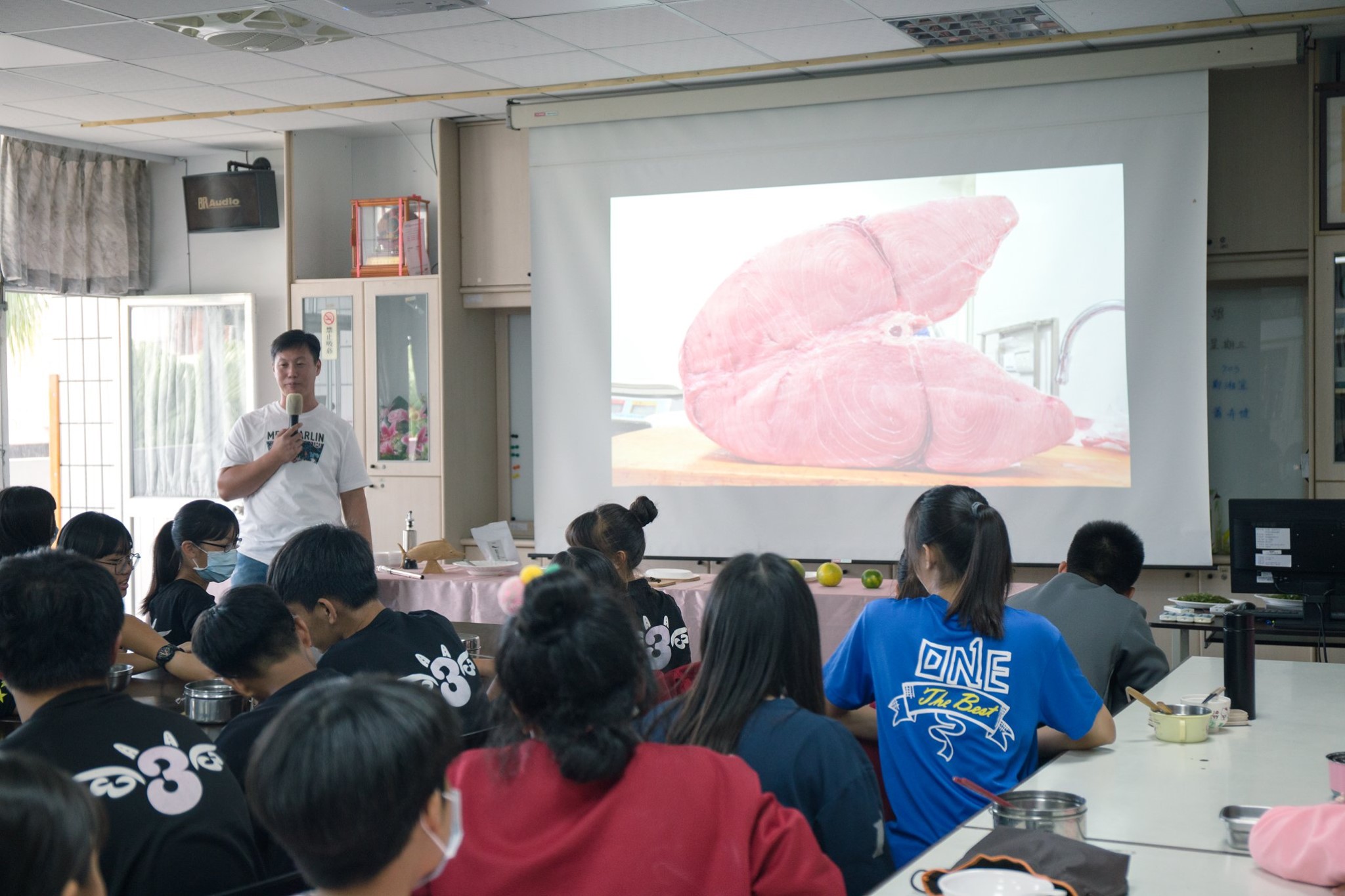在漁會工作20年的李宏勇主任,在長年的經驗累積下,有各種漁業的知識,這次的課程更是不藏私,從新港漁港每年盛產的魚獲,了解當地的物產、魚類特色、魚從哪裡來,漁夫怎麼捕撈,都非常詳細的將自己的漁業知識,轉化使用淺顯易懂的方式分享給同學們。現場也帶來一對剛捕撈上岸的公母鬼頭刀,讓同學們近距離觀察,並且帶來成功佳家自助餐的招牌菜「鬼頭刀八寶丸」、旗魚乾讓同學們品味。