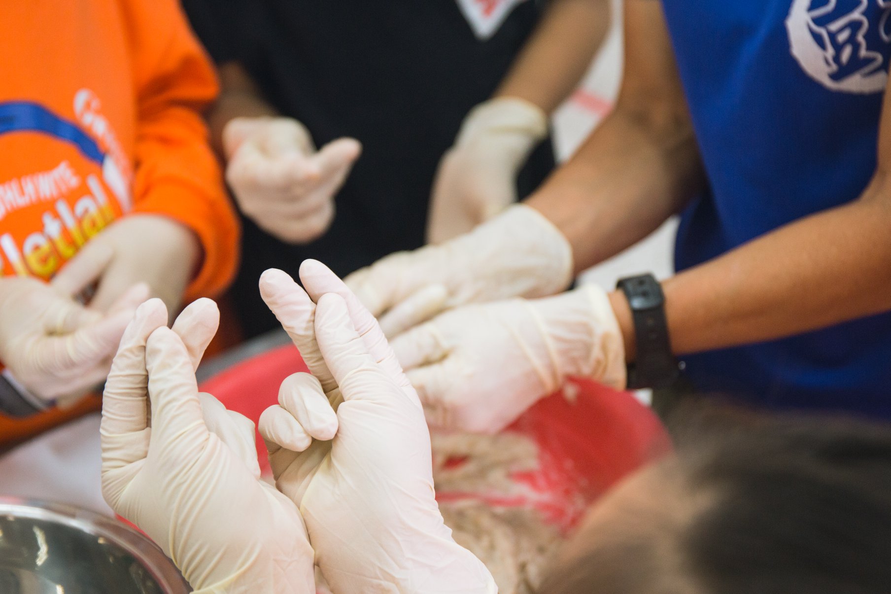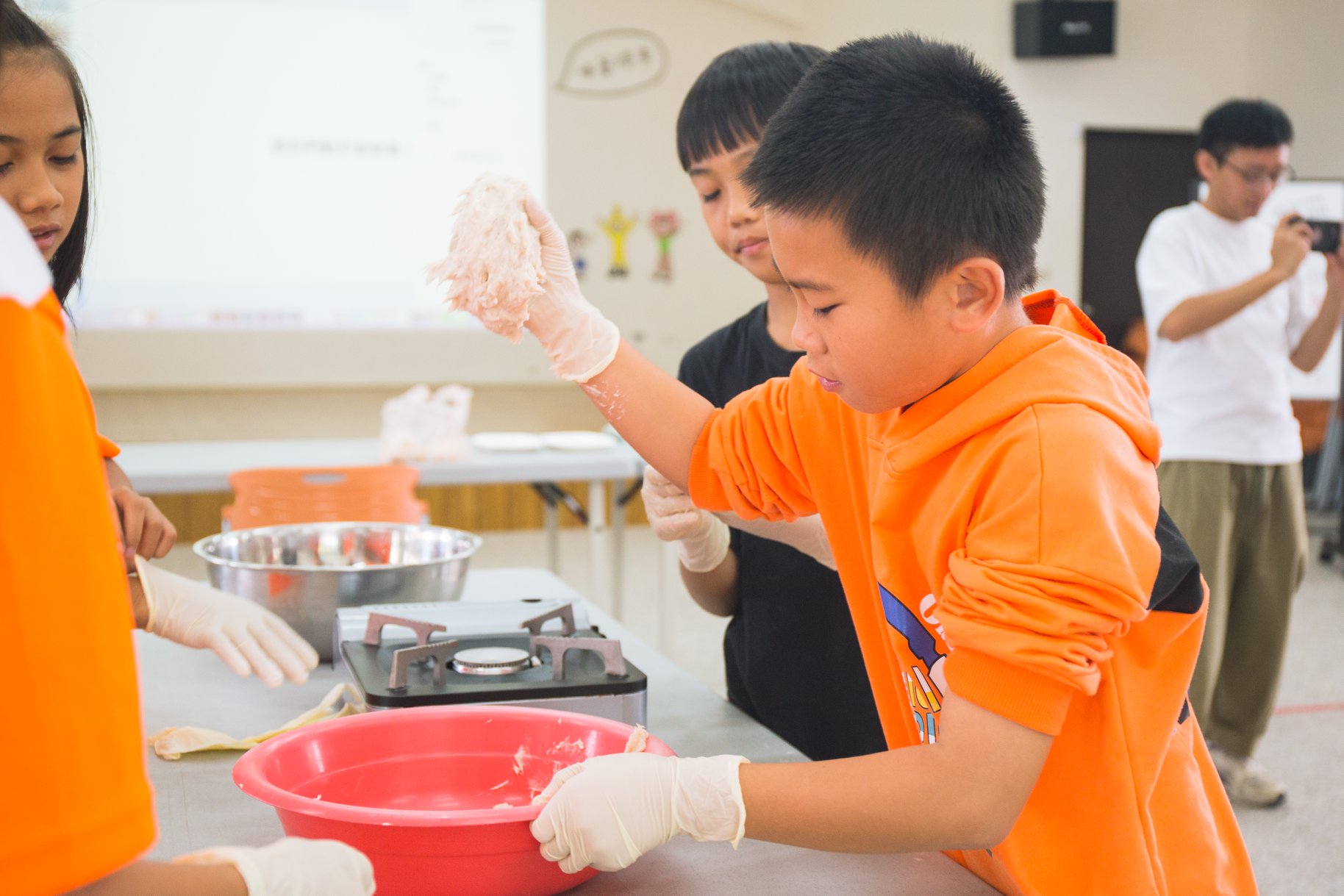 這周來到#信義國小,彭老師帶來自家特至魚漿,魚漿使用的材料除了新鮮的旗魚、鬼頭刀外,還有糖、鹽、地瓜粉漿,由於打魚漿的時候會生熱,還需要加入冰塊,要保持冷度魚漿才不會變質。正式開始製作魚丸,第一個步驟就是用手摔魚漿,將魚漿扎實甩過後,煮好的魚丸口感才會更好。接下來拌入肉燥,增加魚丸的風味,拌勻後將魚漿輕輕握於掌心,透過虎口施力將魚漿擠出雞蛋般的大小,再用另一隻手沾上水,用雙指交叉的剪刀手勢,把魚漿推倒裝入水的鋼盆裡,魚丸成形。