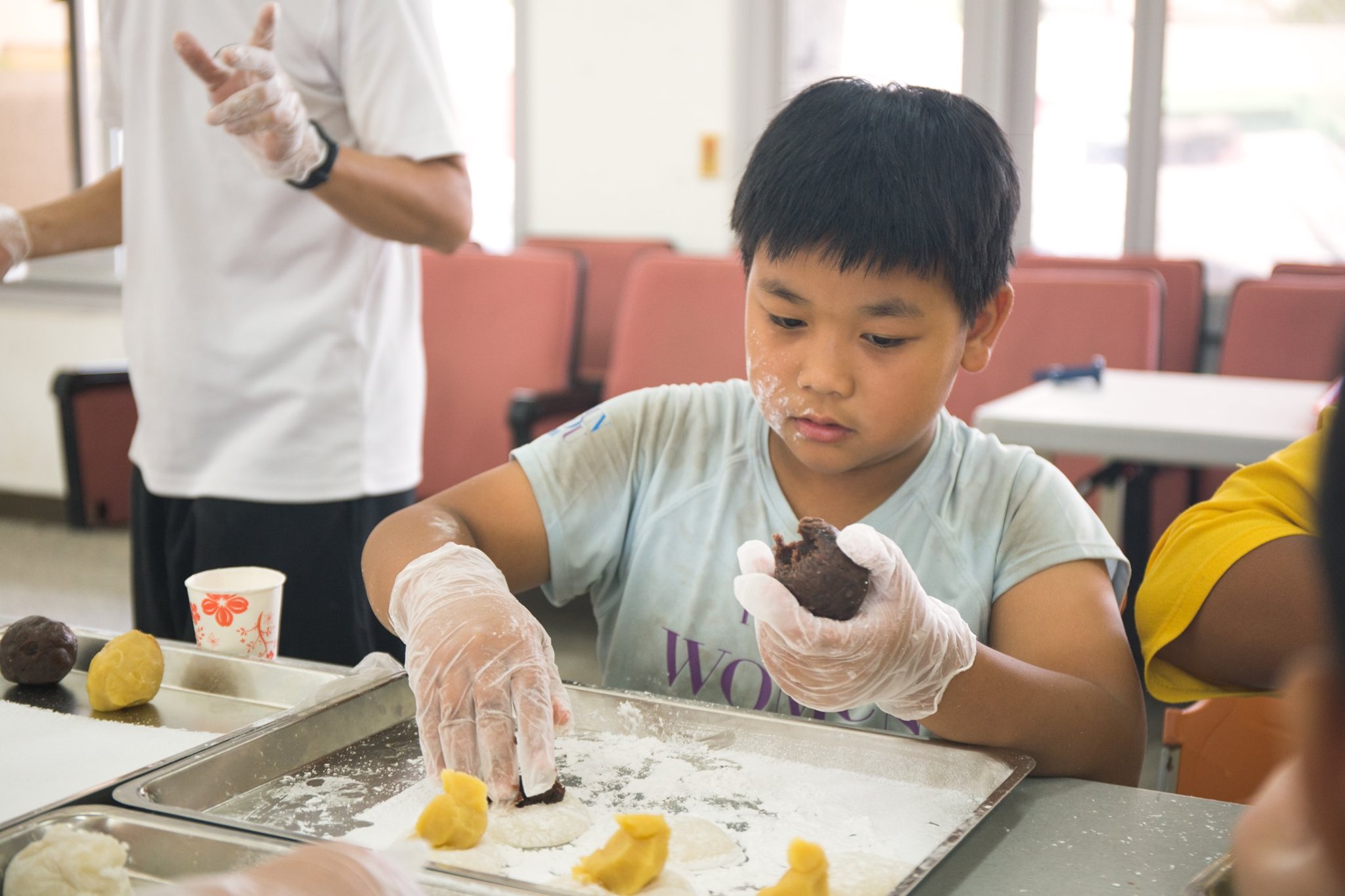 曉龍師傅示範包麻糬的技巧,換同學操作時充分體驗到米團的黏性,發現要捏出像曉龍一樣漂亮的麻糬非常困難,正是長年的經驗累積。其中有位同學說我阿嬤最喜歡吃麻糬,要拿回去給阿嬤,從小我們與米食文化密不可分,近年來米食文化漸漸西化,從麻糬中了解職人的辛苦與精神,也同時是米食文化探索與傳承。
