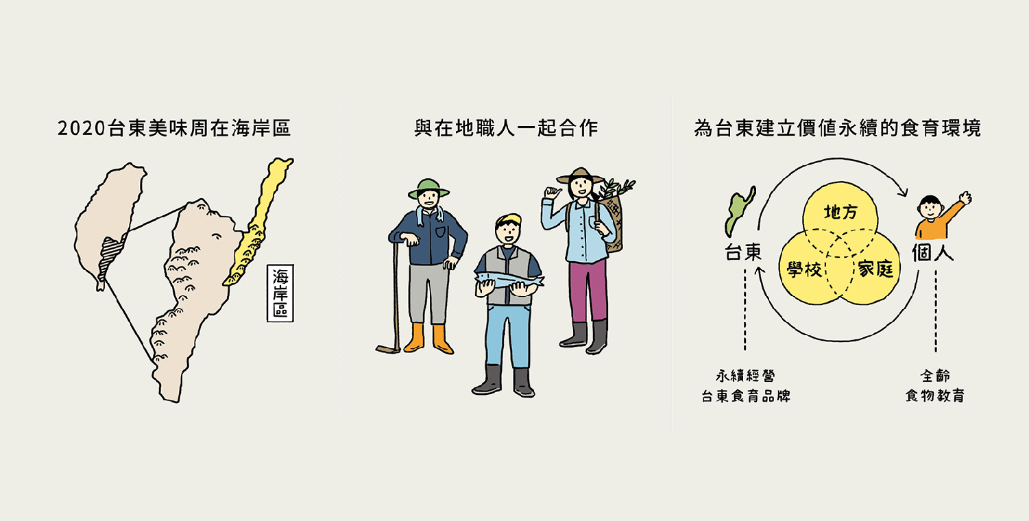 台東美味周,是一個屬於台東的食育校園節慶。食材怎麼來、味道如何、環境可以引發食慾?食的世界博大精深,光是酸甜苦辣鹹,就有不同層次的五感體驗。台東豐富的食材資源及飲食文化,是在地孩子們擁有最珍貴獨特的禮物,然而在速食文化衝擊的當下,如何將這些多元的飲食記憶及食材知識進行傳遞,是至關重要的議題。
