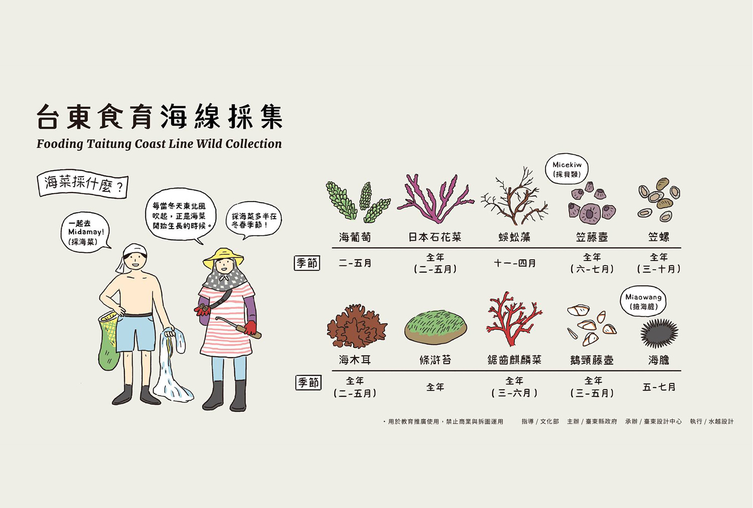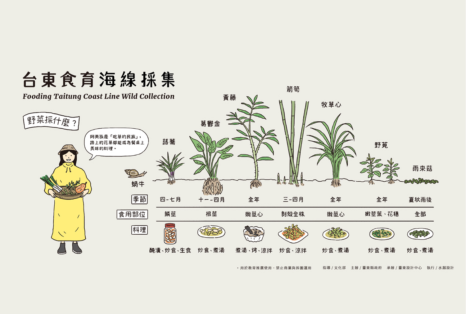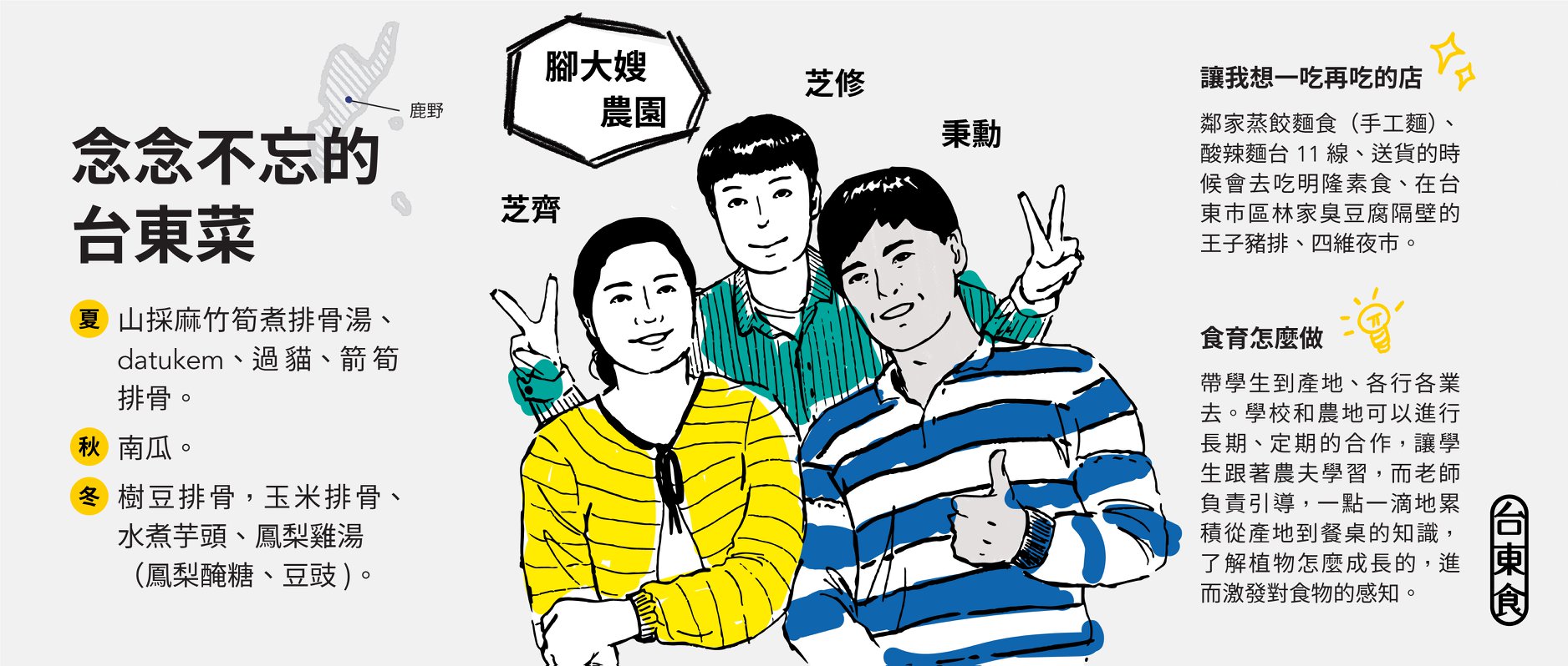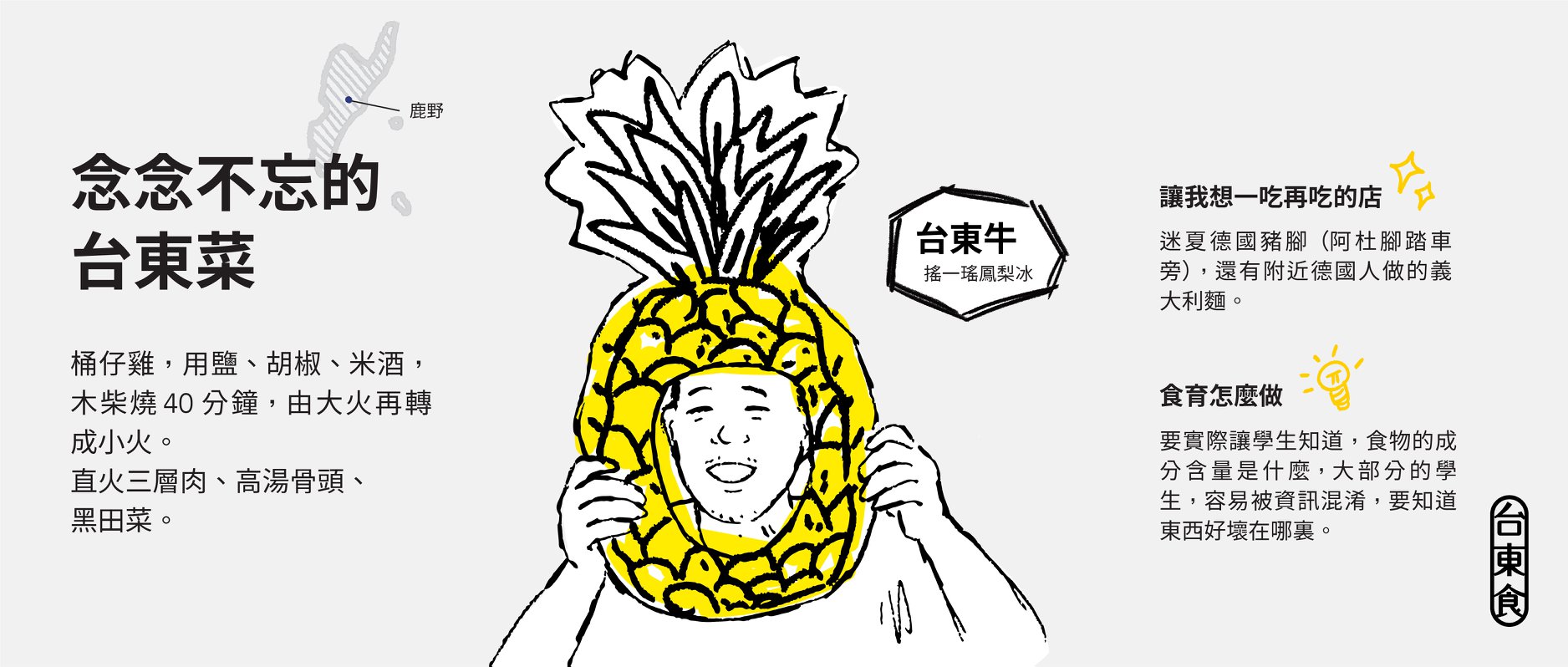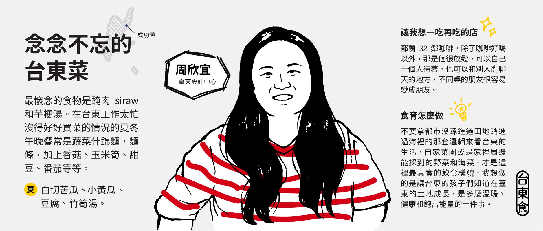 台東食育提案所透過「食」連結在地餐館達人、學校教育及家庭的日常美好風景,內容豐富的地圖及資訊圖表,以「食育新觀點」深入台東風貌。