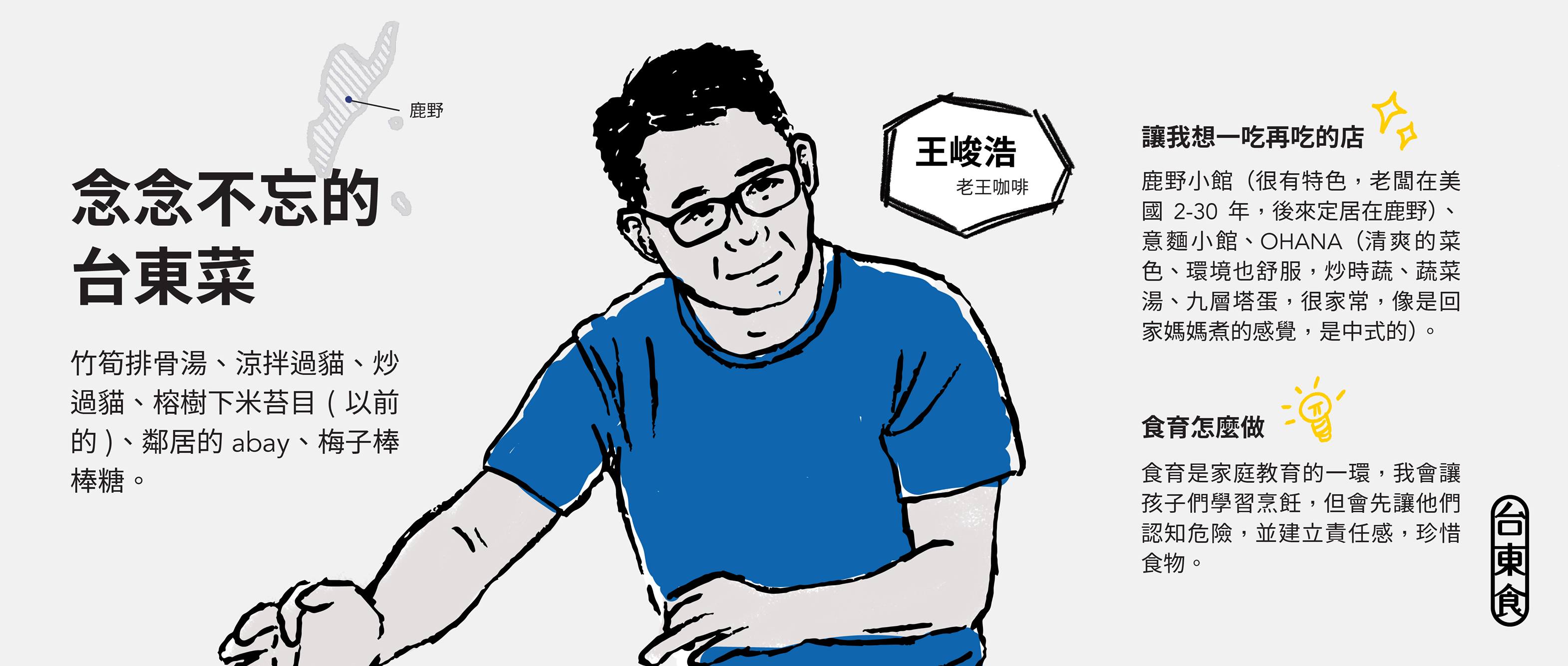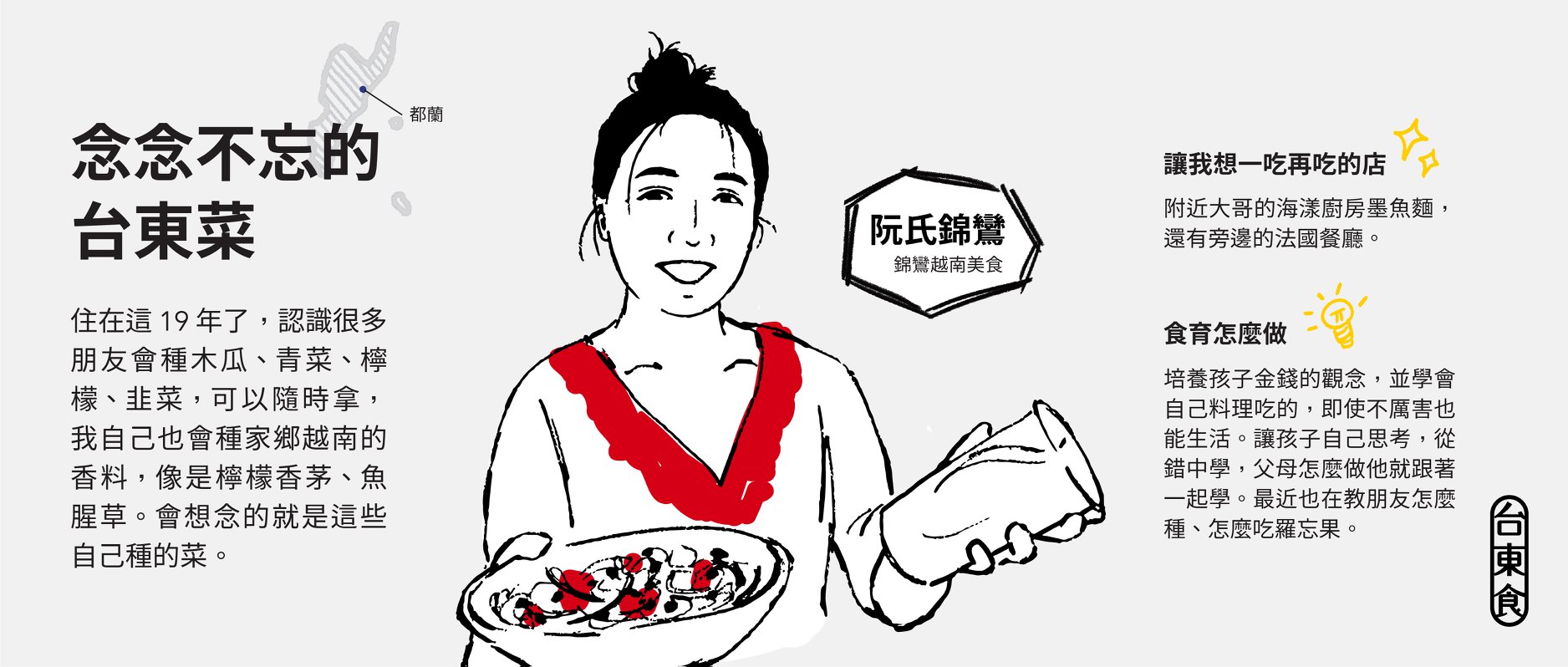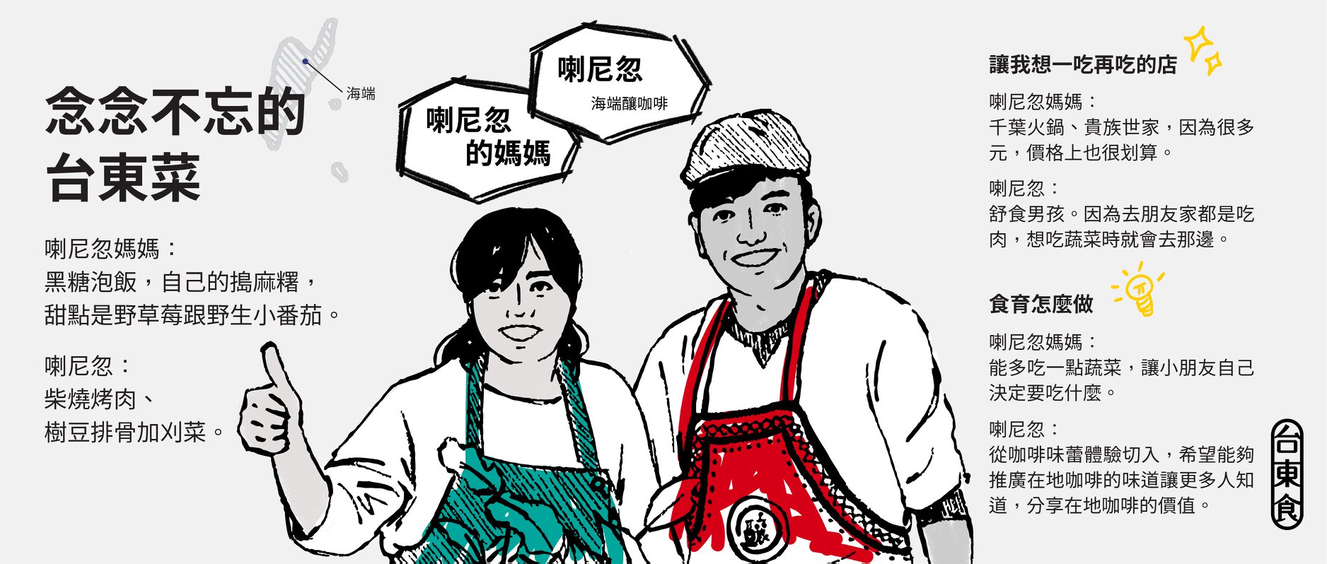 調查員尋訪了50多位台東人,透過大家記憶中的美食,描繪出「地方受訪者」所思念的台東食物。訪談的過程中也看見大家對這片土地的情感及認同,更從中認識了台東的料理。