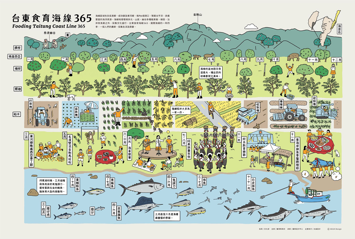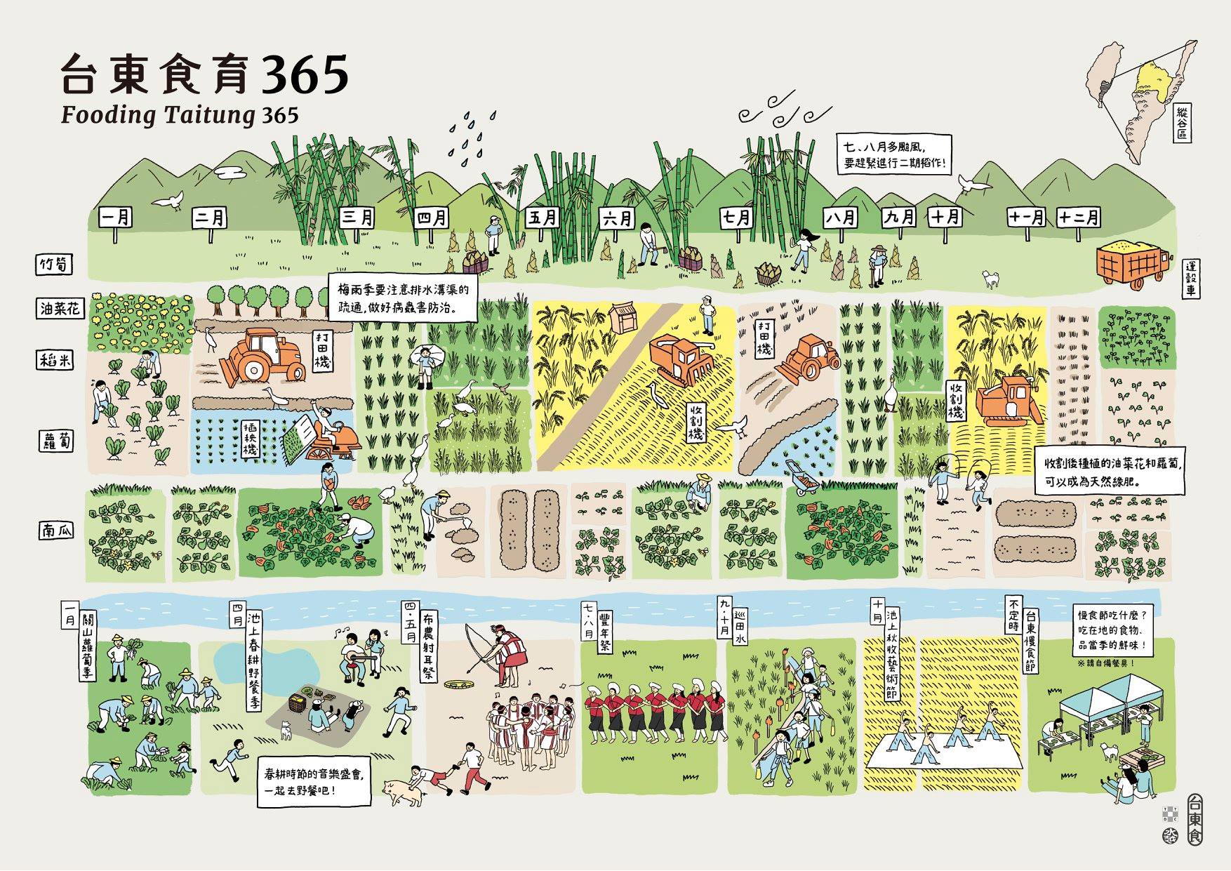 台東食育365,透過台東縱谷、海線的作物與節慶地圖,記錄台東農作的小知識和食物相關有趣的活動。