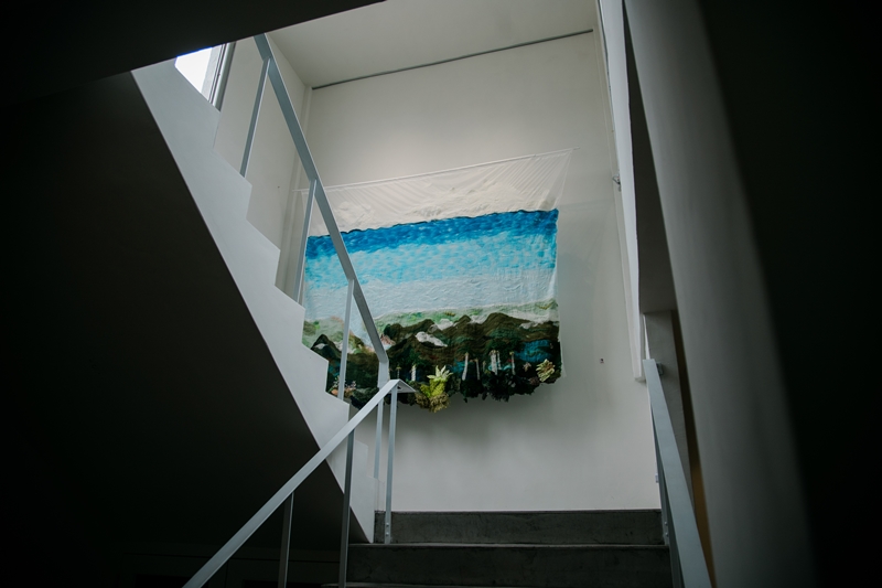 在設計中心的樓梯間,有羊毛氈藝術家王荷瑄,對於山-海-人 People &Culture,將文化採集的過程收斂在作品上,用羊毛氈跟刺繡的技法,把旅行的過程,將細節創作在掛簾上。