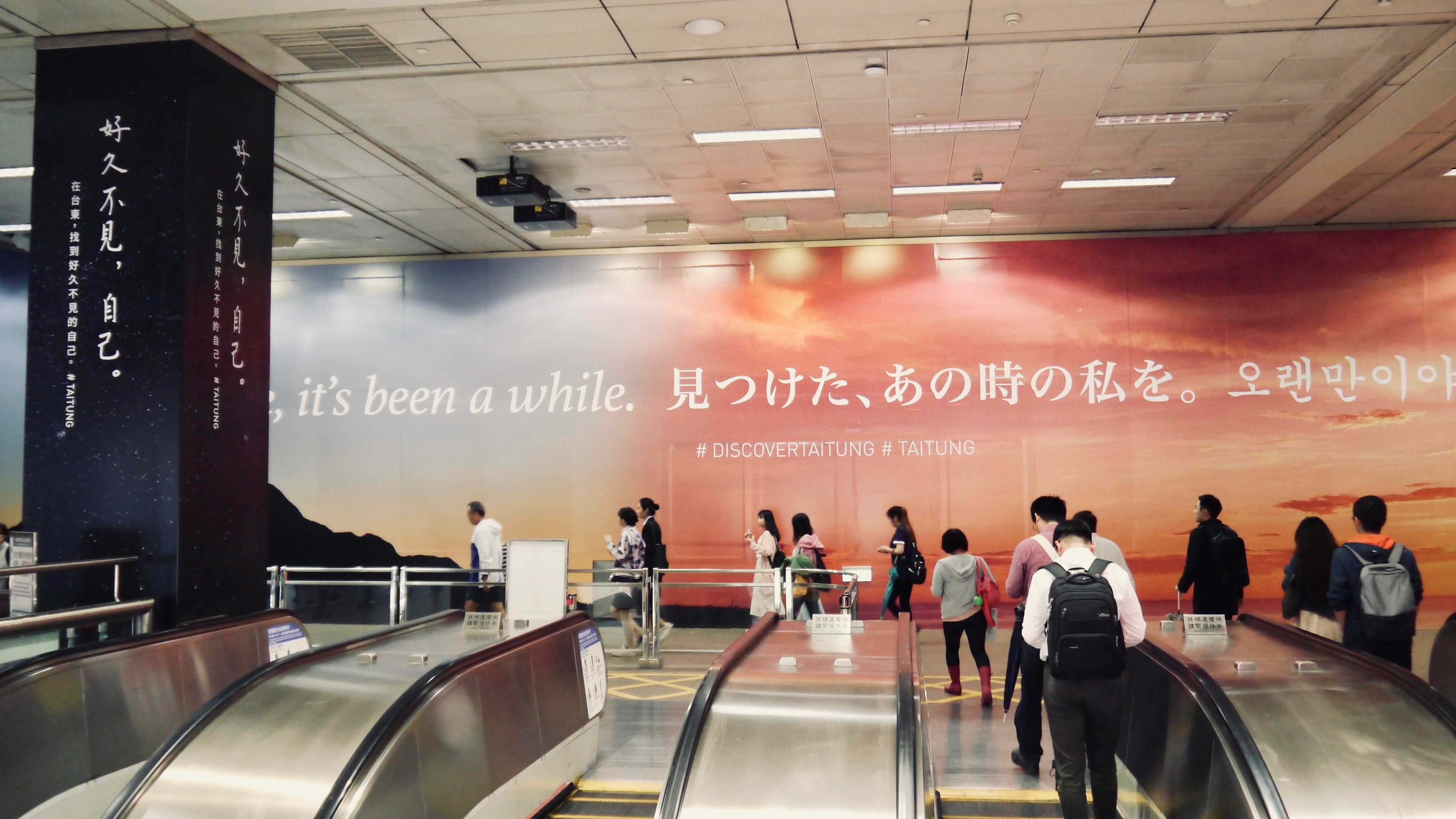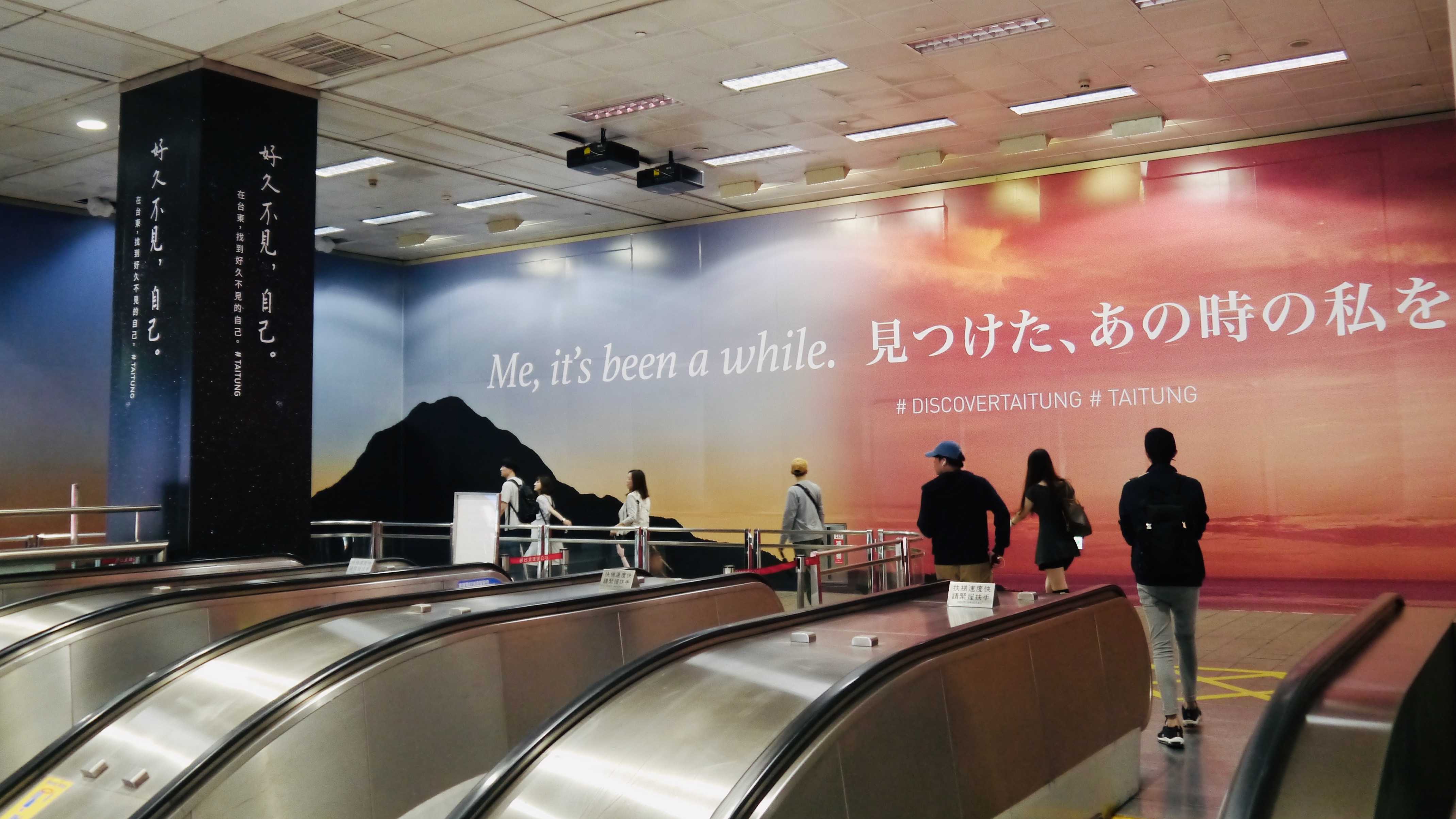 該場域的三面版位呈現臺東代表性景點「都蘭山 (山)、金樽 (海)、嘉明湖 (空)」,呼應該區域彎口與上昇手扶梯的視覺感,使用單純化大幅視覺,沒有太多添加元素或色系、避免過往大型廣告看板形式常會造成的視覺壓迫感,希望讓觀者感受到臺東的廣闊自在。暗示傳達臺東的「純」與每一位城市中過路者需要的「靜」,在臺東就可以發現。