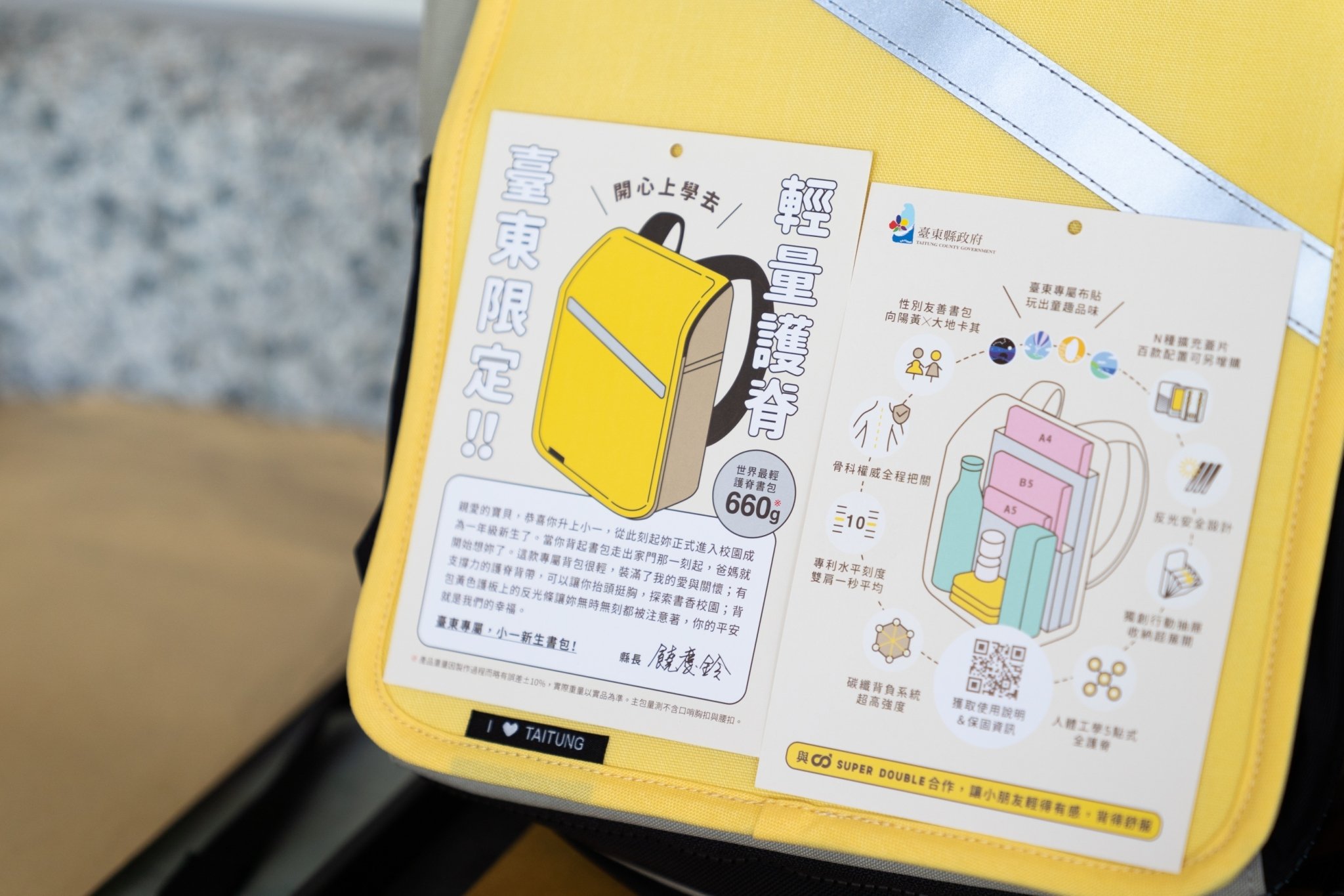 臺東縣政府協同臺東設計中⼼共同發行全臺第一個極輕量護脊書包 ,以結合臺東元素及美學設計為出發點,並兼顧符合人體工學的護脊設計,不僅滿足學齡孩童的成長需求,同時也將性別友善與美感教育 ⼀起帶進校園!