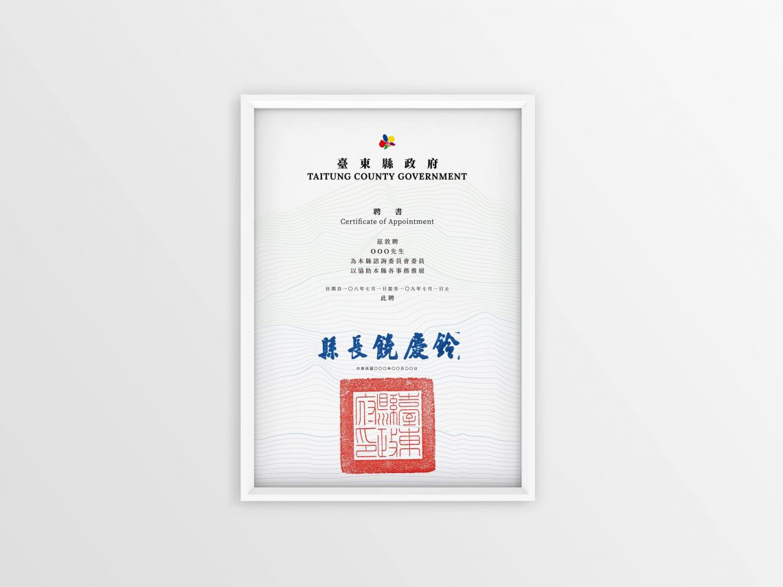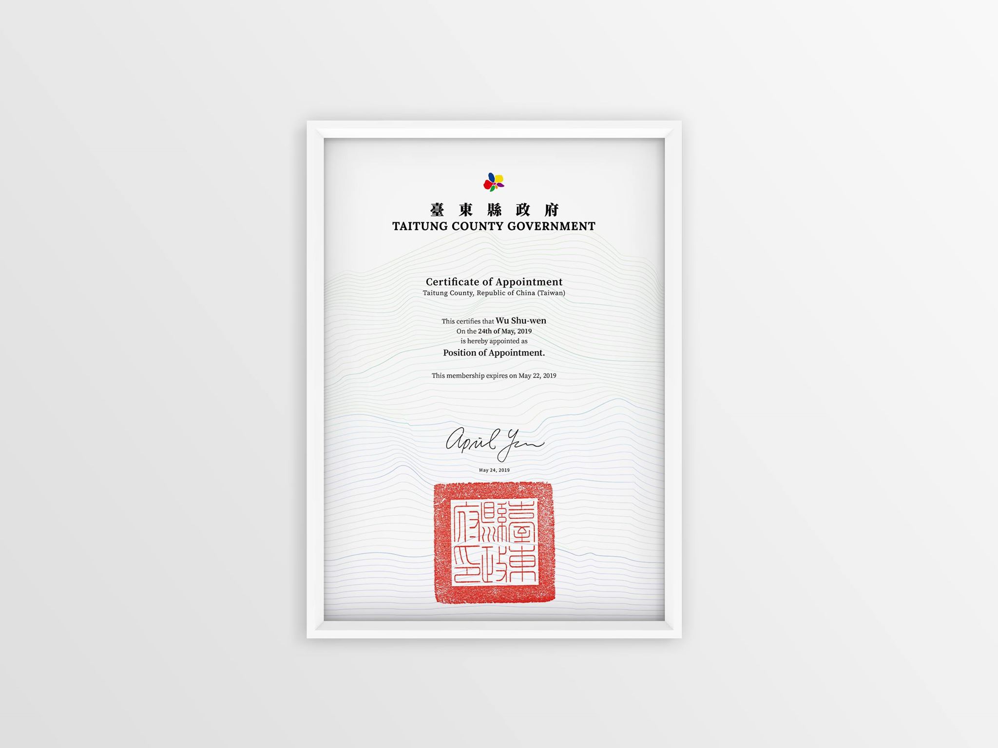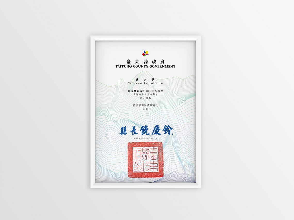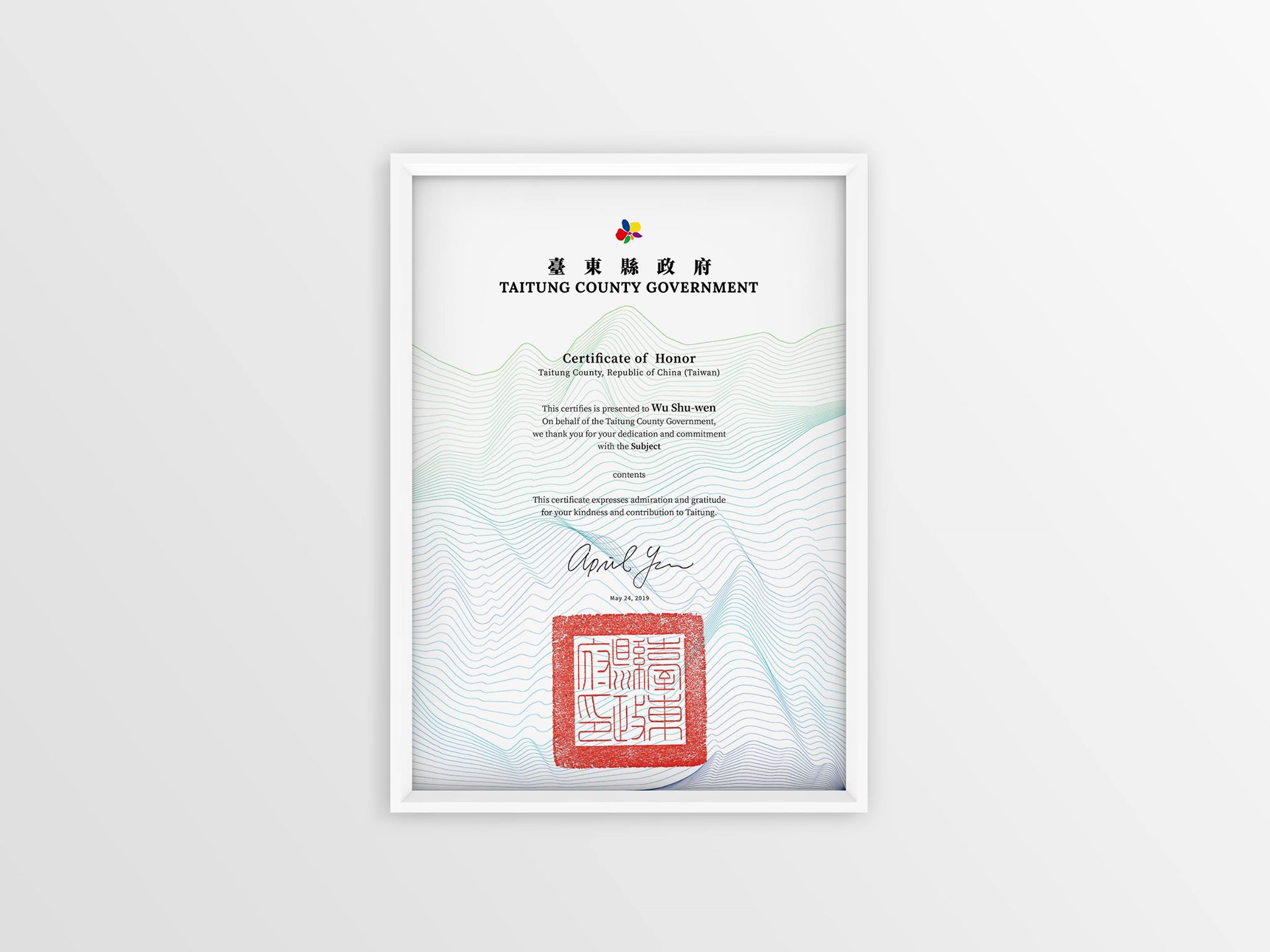 臺東縣政府書狀設計物包含獎狀、感謝狀、結業證書、聘書及紀念品贈卡,至民國92年沿用至今已超過十年。這次設計理念以臺東的山、海、空的自然線條與色彩為發想,融入整體設計之中。運用臺東的自然風景展現書狀的榮譽感,除了傳遞受獎者和地方的連結及認同,更是將臺東得天獨厚的地理特色構成這片土地的驕傲。