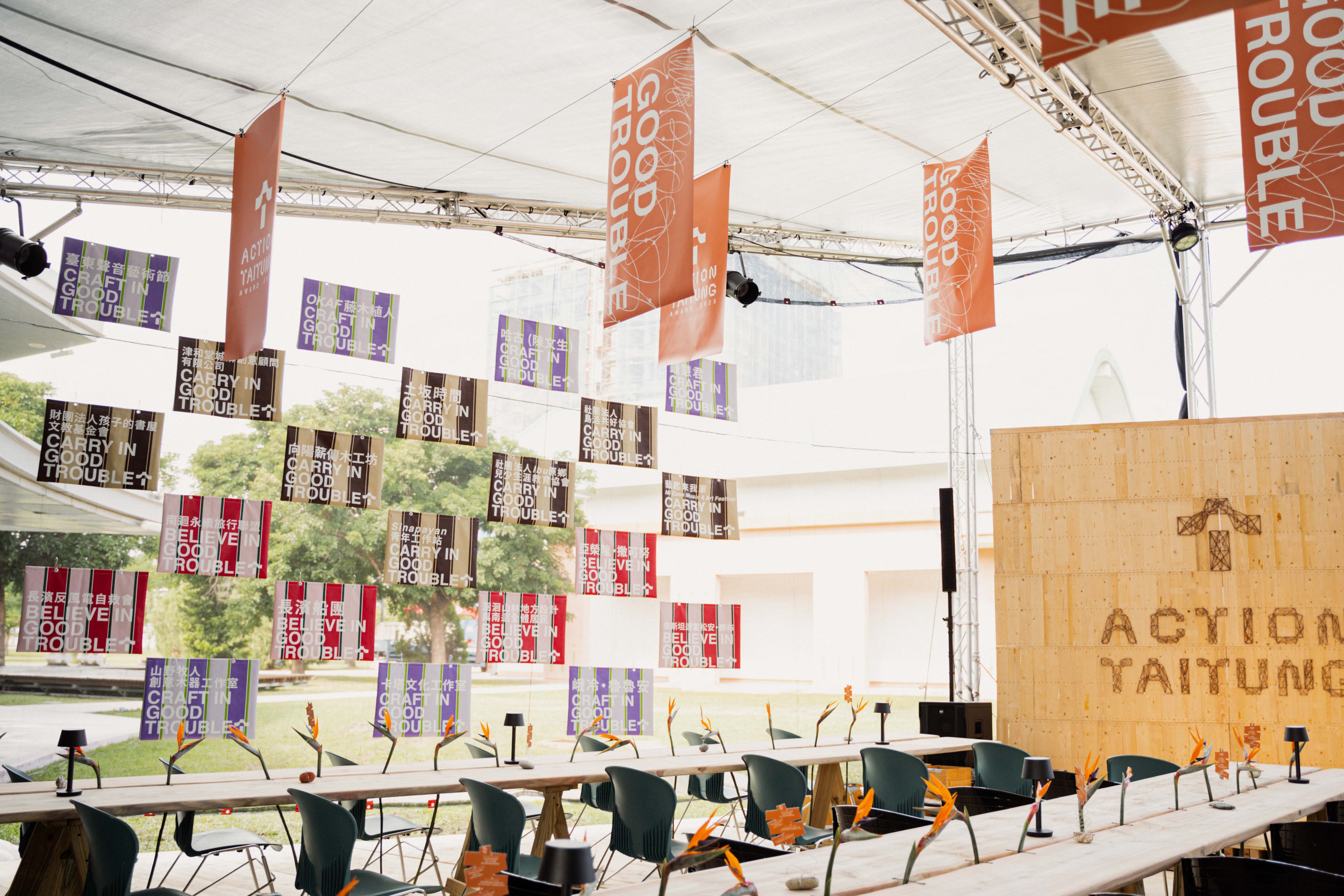 而在空間設計方面,設計團隊「無氏製作」觀察,這幾年臺東南島文化能量爆發,觸發民間組織熱衷投入自造南島式帆船,團隊因此找來「向陽薪傳木工坊」合作,以船身長度與船體材質,量身訂製典禮桌板,並將於活動結束後,將材料回歸予木工坊用於未來的造船工作,完成一場材料再利用的循環軌道。
