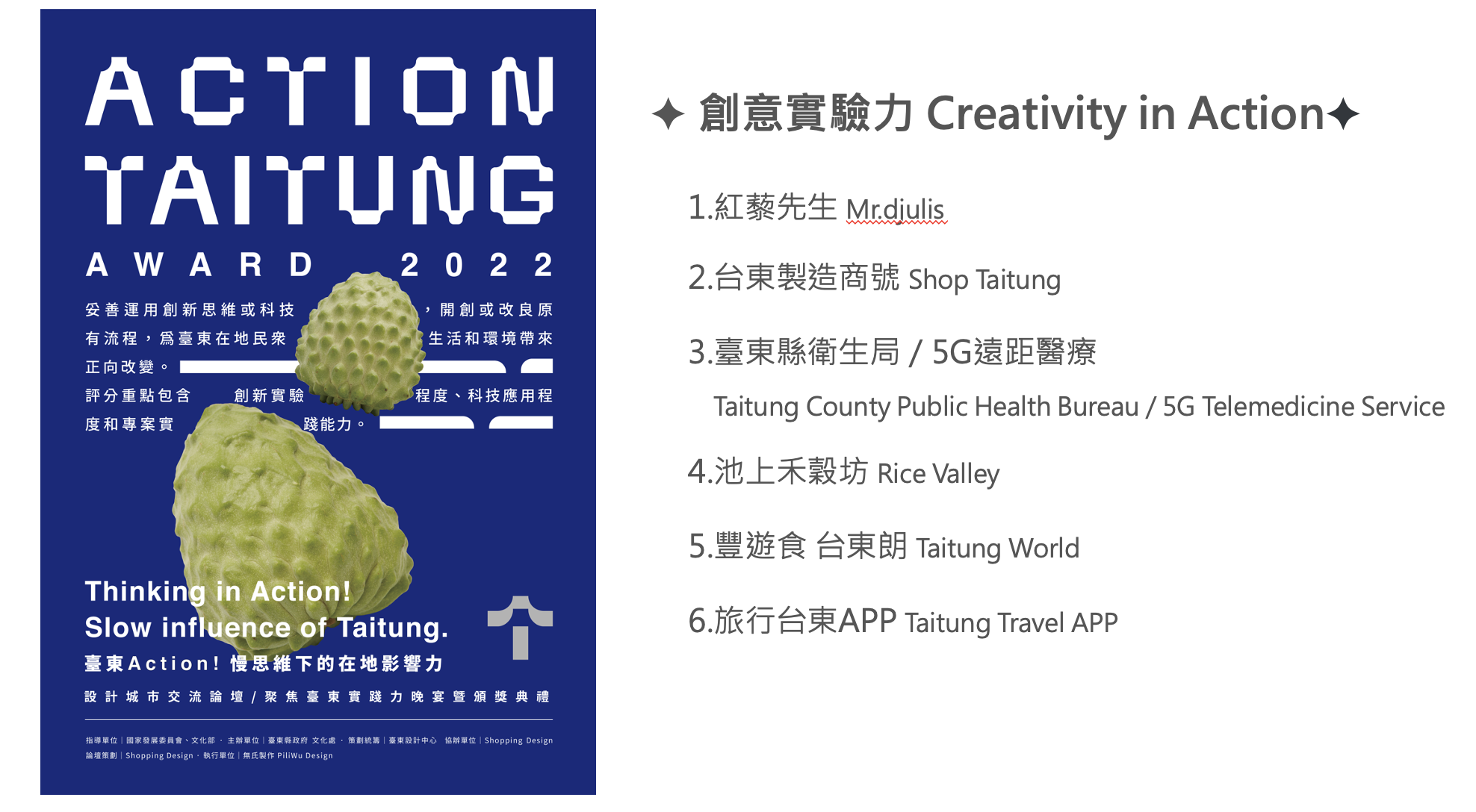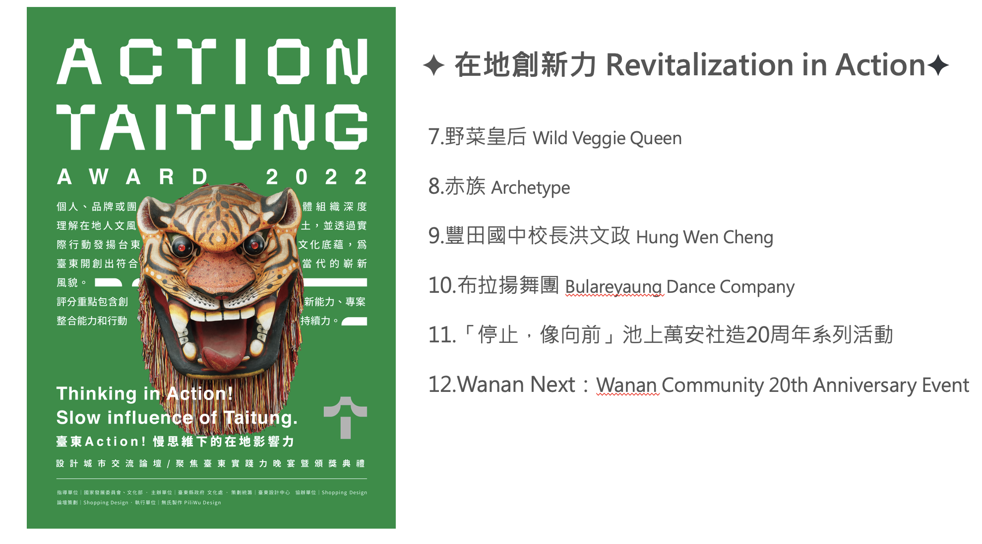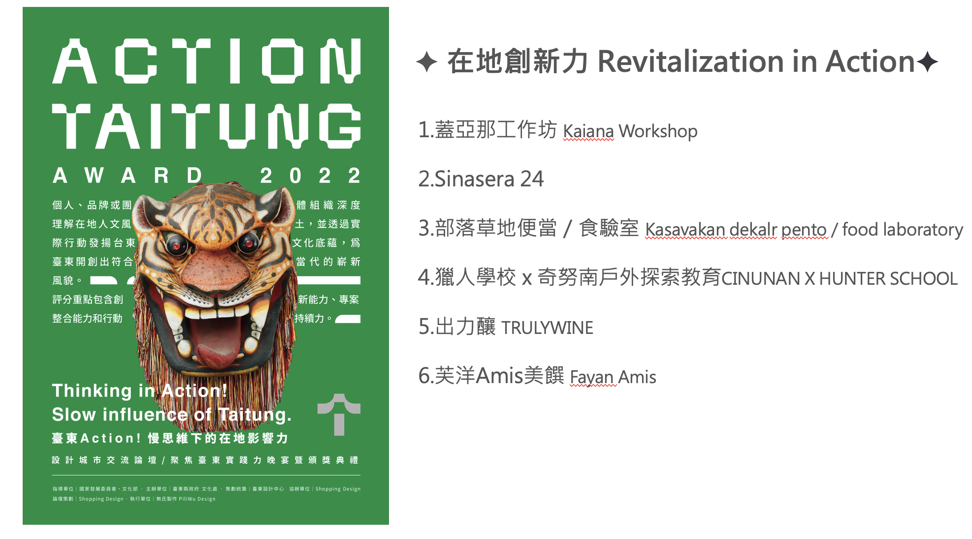 「2022 Action Taitung Award」鎖定「國際連結力 Connection in Action」、「創意實驗力 Creativity in Action」、「在地創新力 Revitalization in Action」、「設計美學力 Design in Action」、「永續關懷力 Sustainability in Action」、「評審團大獎Jury Prize」,共六大獎項、40組獲選名單。在今年度40件精彩案例中,不論是公單位乃至⼩型的⺠間組織,都可以看見透過富有意義的實際行動,為土地與⼈帶來正向影響,即使成果並非⼀日可⾒,卻能在這些行動中看⾒累積的價值,因⽽造就今⽇臺東這座城市的獨特魅力。