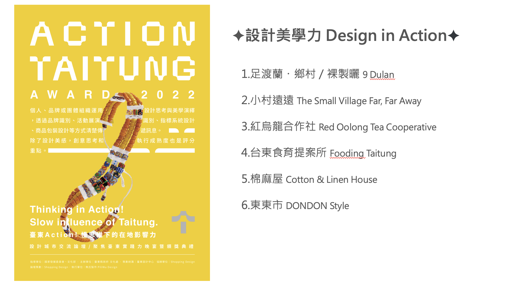 為鼓勵臺東在地以慢 (slow) 經濟的思維出發,搭配政策的快 (action) 行動力,由「快」支持「慢」,讓「一快一慢」成為臺東推動慢經濟的理念。由臺東縣政府主辦、臺東設計中心策劃統籌,於2022年舉辦臺東首屆指標性設計獎 ——「Action Taitung Award」,聚焦臺東慢思維、地方實驗性、行動實踐力三大主軸,希望藉由獎勵機制與分享交流,發掘臺東具影響力的事件、單位或個人。