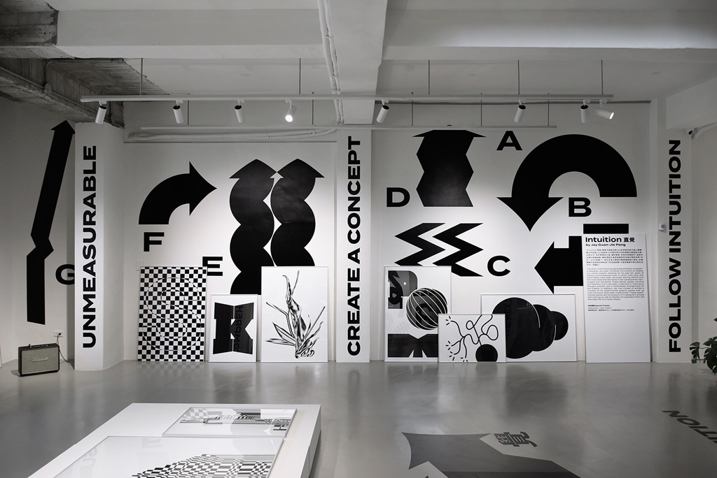 本次的展覽,展出Jay從過去執行的設計案中所提取的元素,在去除文字、色彩等資訊後,重新整理、安排的視覺創作。作品看似直覺抽象,實則是經過縝密思考後的理性安排,忠實述說創作時的思緒。展覽也將透過圖像實驗作品,分享設計師私底下的自我訓練,傳達視覺創作者日常生活的一閃靈光。展出作品內容集結「Intuition 直覺」一詞所具有的方向性和速度感,透過「箭號」來處理主題和造型,真誠地表達創作的初衷,亦成為解釋過去至當下狀態的路徑 ; 設計師更將設計思考的過程轉換成一連串的空間探險和實驗,以不同的作品裝置、極大量的視覺圖像編排來解讀空間。在觀展時不妨放空腦中所有的想法,⼤大膽地跟隨直覺,在展場中與一個個錯落的符號和圖像產生對話與連結。